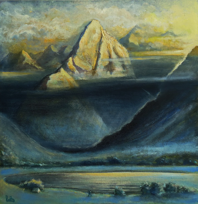 Крайняя работа, завершенная в мастерской Краматорска по акварельному эскизу 1976 года во время горной четвертки у озера Туманлыкёль. Ниже - фото отснятое в теснине Гоначхир после радиального выхода на Четчу Западную с юга.
