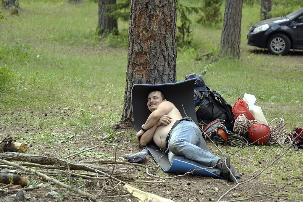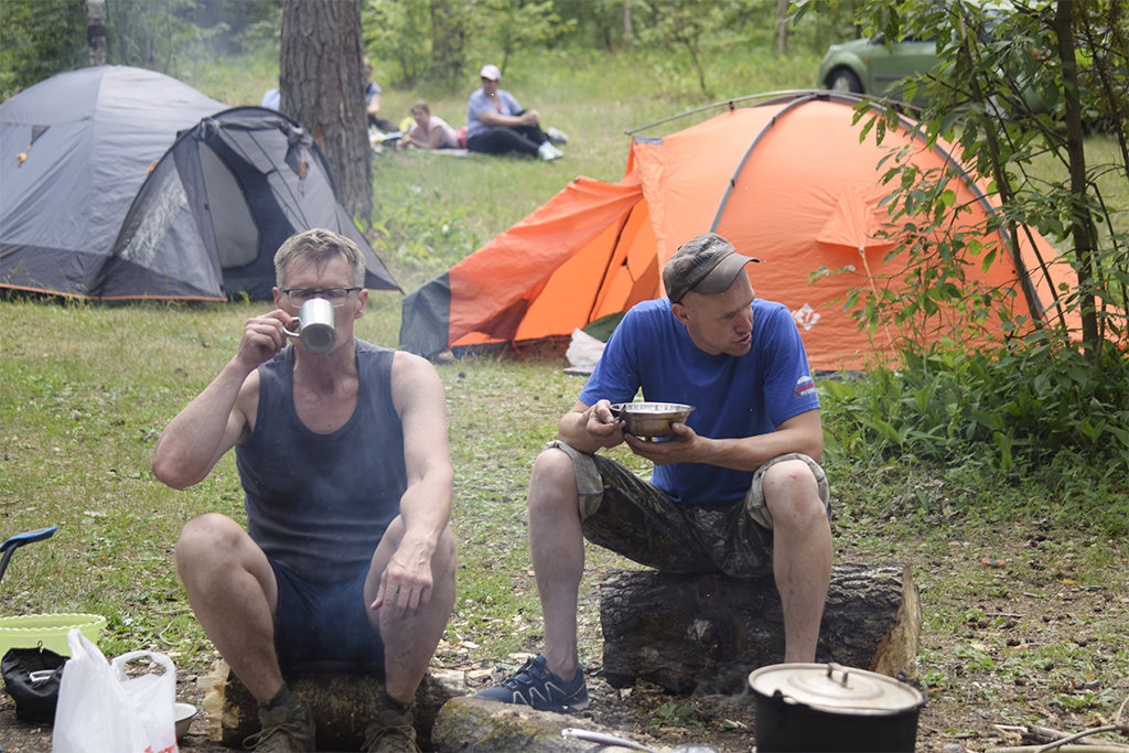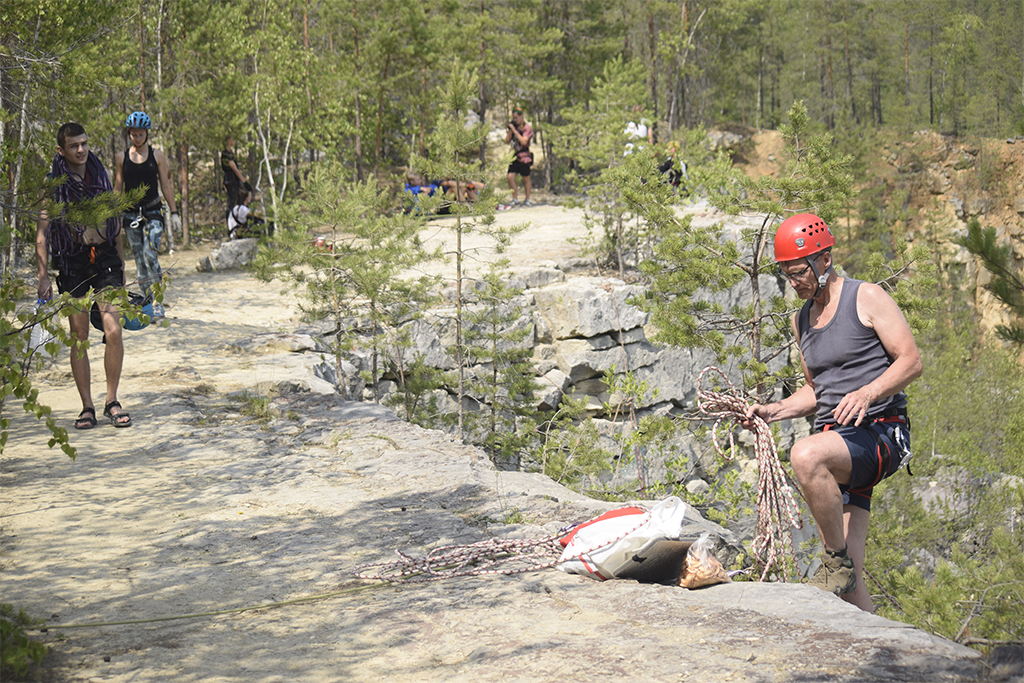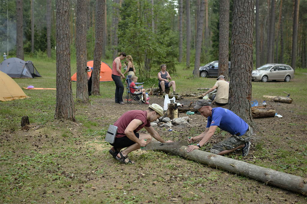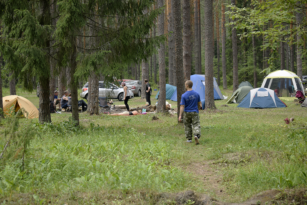 В Дюкино всегда много народу, особенно летом. А еще, это Владимирская область и надо проехать 280 км, чтобы туда добраться. Поэтому мы решили выехать в пятницу вечером. Добрались поздно, в 11 часу вечера, но успели занять шикарные места на стоянках. Правильно сделали, потому что с утра приехало еще больше людей, вставших лагерем вплотную к нам. Мою палатку подперли с одной стороны, и я про себя думал, что наверное это какие-нибудь невоспитанные москвичи. Однако, скоро я узнал, что эти люди приехали из Костромы! Это была группа из нескольких семей, у которых маленькие дети тренировались в скалолазании. Они приехали, когда мы уже проходили скалолазные трассы в каньоне. Потом и они пришли и заняли трассы около нас. Кстати, среди них оказались знакомые лица! Вот так и шутили: «Ну где еще встретиться костромичам?»