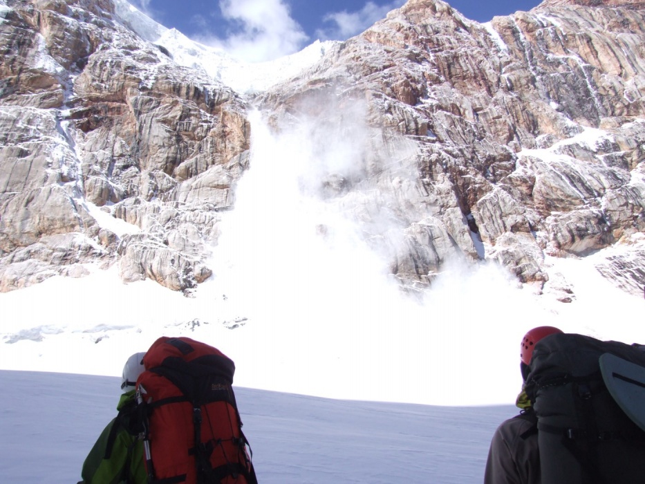 После 9 утра небо начинает затягивать облаками. В 10:30 подошли под перевальный взлет. Облачно, временами идет снег. Осматриваем перевальный взлет – стена засыпана снегом и залита льдом. Отказываемся от варианта прохождения «в лоб», и решаем двигаться по системе наклонных полок. Залитые льдом и засыпанные снегом крутые до 800 скалы представляют серьезное препятствие. Люди, согласно описаниям, заходили чуть ли не пешком, а нам пришлось повернуть. В попытках преодолеть нижнюю ступень скал мы потеряли больше 2 часов. К этому времени погода испортилась окончательно – сплошная облачность, снег, со стены перевала летят обломки льда и камни. Решаем оставить прохождение перевала на завтра, и тут же на леднике, под перевальным взлетом, встаем на ночевку. Со стен Замка и Бодхоны сходят лавины. Прекрасно понимаем, что лагерь стоит в безопасном месте, но тем не менее зрелище впечатляет. Вечером связкой-двойкой еще раз сходили на разведку, наметили вариант прохождения на завтра.