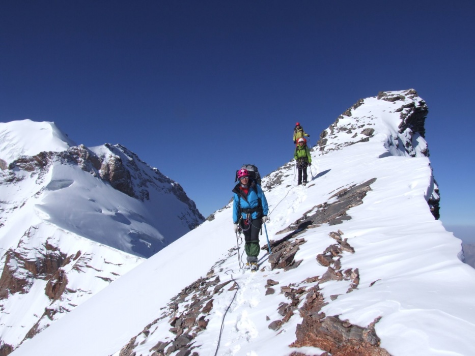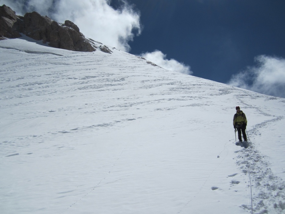 Проснулись в 4:20. Ветер совсем стих, морозно. На восхождение с бивака вышли в 6:45. Идем связкой на безопасном расстоянии от гребня. Идти очень тяжело, тропим, проваливаясь больше чем по колено, меняем ведущего. На подъеме по снежному склону к скальному поясу вправо обходим большой разлом и по снежному мосту с попеременной страховкой переходим через бергшрунд. К 9 часам подходим под скалы и движемся влево. У смыкания гребня и скал вешаем веревку перил на траверс влево за угол 15 м до камина, выводящего на гребень. Станция на ледорубе, промежуточные точки на френдах и закладках. Все наклонные полочки, по которым проходит траверс занесены свежим снегом. Приходится сметать его, прежде чем взяться за зацепку, поставить ногу или найти подходящую трещину для закладки.