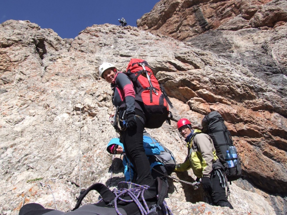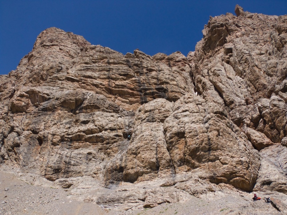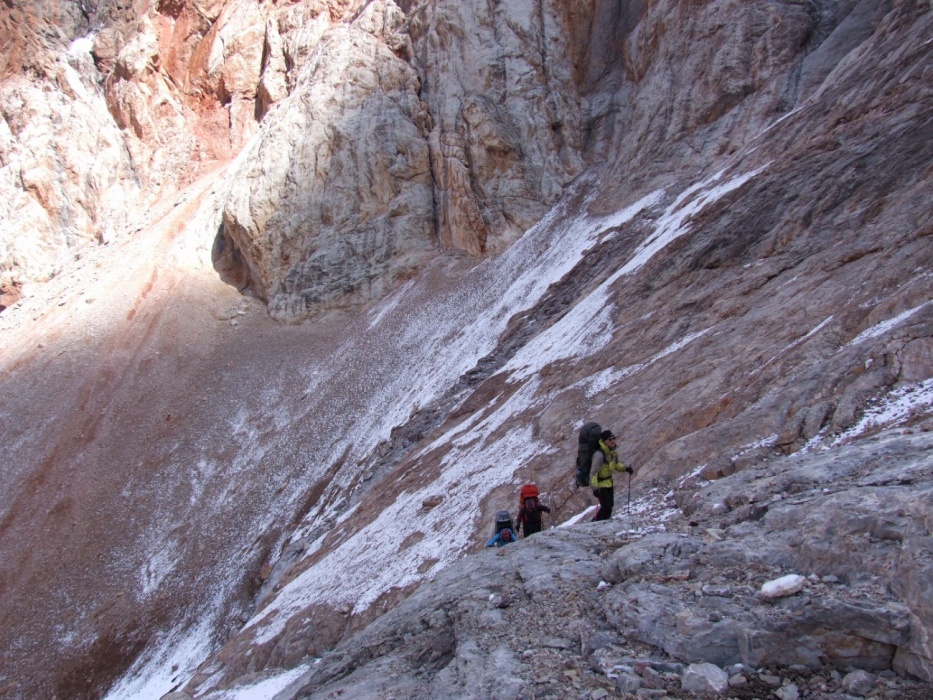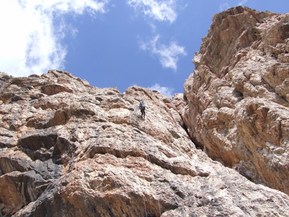Проснулись на полчаса позже обычного – в 5:30. Спуск начали в 7:50. От тура прямо вниз пешком по скально-осыпному кулуару, с гимнастической страховкой приспустились на вершину первого скального бастиона. Первая веревка (около 40 м) вниз до небольшой полочки, на которой собралась вся группа. Станция на крючьях, крутизна до 700. Вторая веревка (еще 40 м), выводит на осыпную вершину второго бастиона. Станция также на крючьях, крутизна до 850, последние 5 метров отрицательный участок. Траверсируем осыпь вправо п.х.д. метров 50 под скалами бастиона до большого камня. Еще веревка 45 м вниз со скал второго бастиона. Станция на большом камне, крутизна до 850, последние 10 метров отрицательный участок.