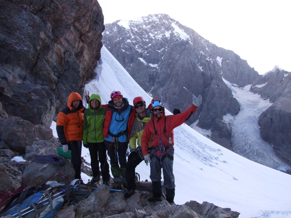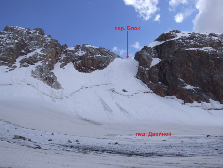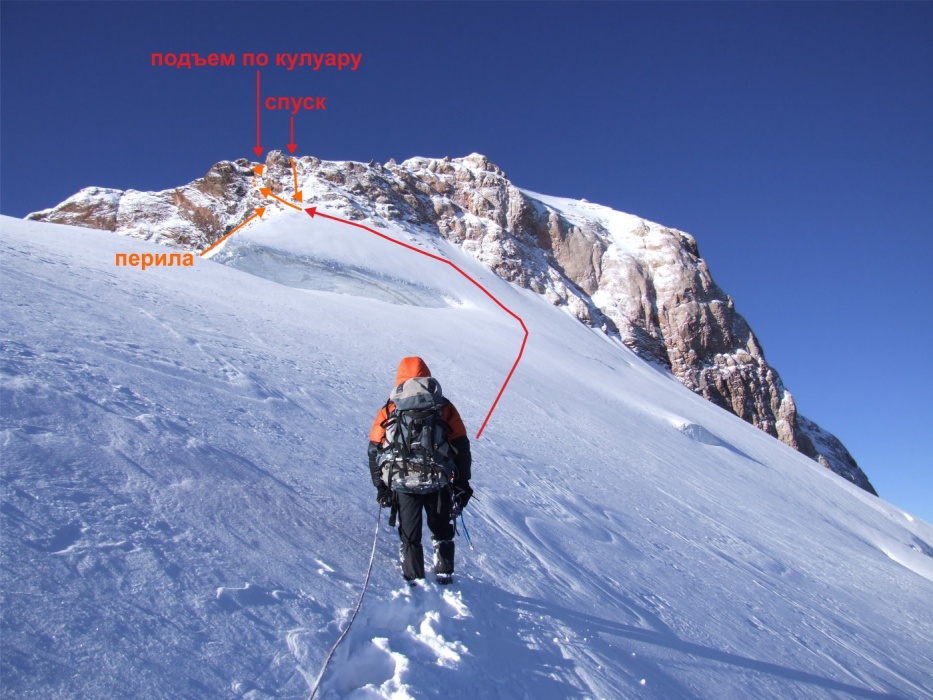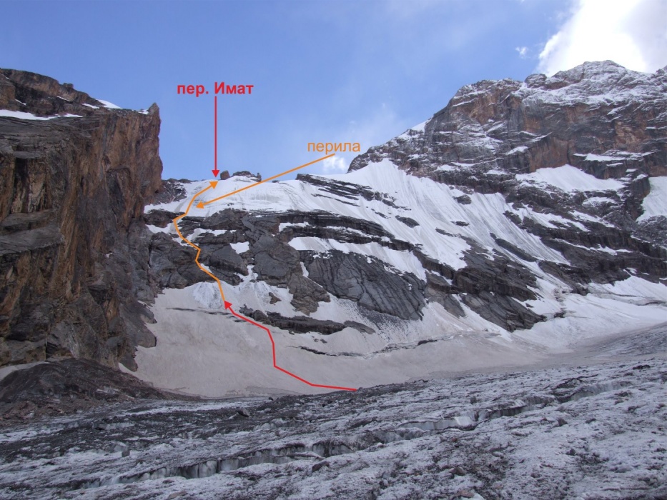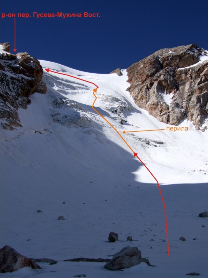 Подъем в 4:00. Собрались, сразу же разобрались по связкам, вышли в 6:15. За 10 минут подошли под склон. Подъем на перевал осуществляем под скальным ребром в. Кораблики. Два бергшрунда в нижней части склона проходим одновременно, крутя промежуточные буры. Выше трещин движемся с попеременной страховкой – две веревки по льду и снегу до выхода на скалы. Ориентируемся на выраженный снежный кулуар. Далее – ключевое место подъема: мокрая обледенелая вертикальная скальная ступенька высотой метра четыре. Поднялись по трещине с ручейком, первый идет без рюкзака, страховка на френдах и закладках. Станция на скальном выступе. Выше провешиваем еще две веревки по простым некрутым, засыпанным снегом скалам, точки страховки на френдах и скальных выступах. На протяжении всего подъема надо быть очень внимательным, сверху летят куски льда и камешки, вытаивающие из склона. Выходим на снежно-ледовый взлет крутизной до 550, движемся «связка по связке», страховка на ледобурах и ледорубах. До выполаживания провесили 9 веревок. К туру выходим в связках, по снежному полю, левее большого жандарма. Итого на подъем провешено 14 веревок: 3 по скалам, 11 по льду и снегу. Группа собралась на перевале в 16:30.