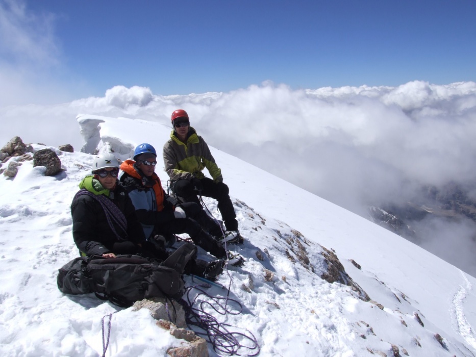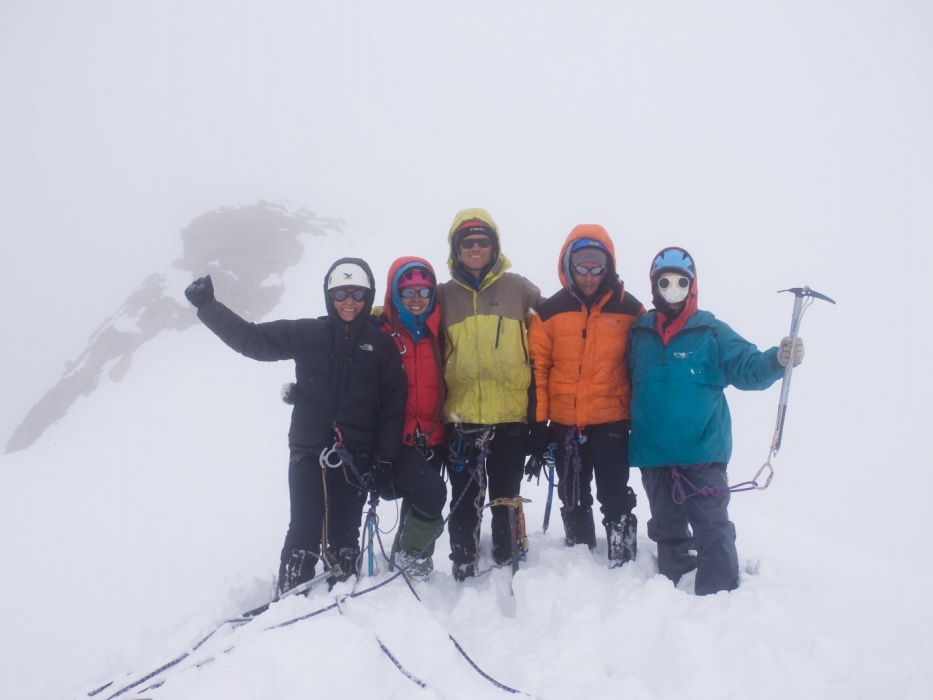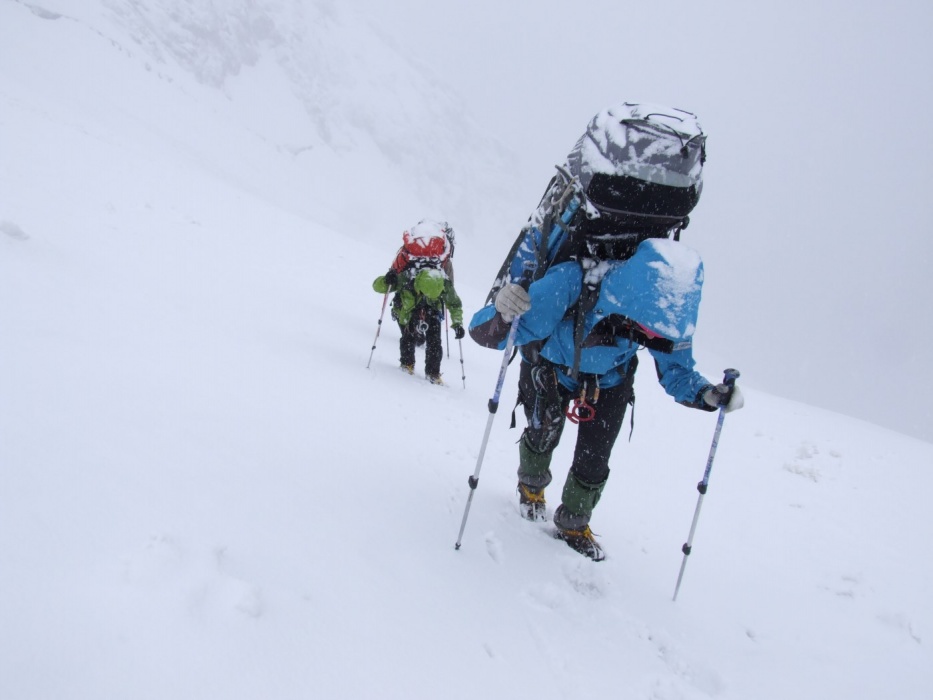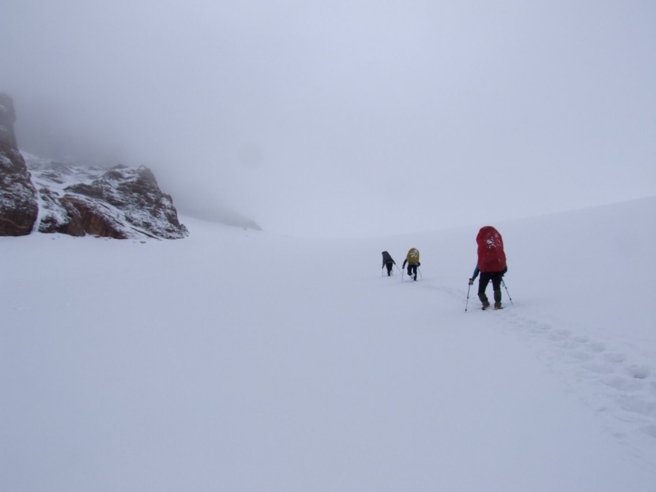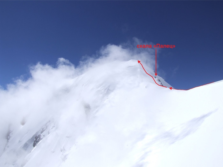 Траверсируем склон в обход большого жандарма и выходим на гребень. Удобнее идти траверсом и дальше, но мы побоялись подрезать перегруженный снегом склон. По гребню подходим к предвершинному взлету. Видимости нет, идет снег, в тумане подходим к скале в виде пальца. Подъем по широкому снежному гребню прямо вверх, не подрезая склон, в глубоком (местами по пояс снегу). Здесь уже не ступени делаем, а траншею роем. На гребне встречаются трещины. Около 300 метров подъема и вышли на выполаживание. Прошли по пологим снежным валам. К сожалению, на нашем GPS-навигаторе точка с вершиной поставлена не была. В район вершины вышли в 13:20. Долго бродили в полном тумане в попытках найти тур, но так и не нашли, возможно его засыпало снегом. Наш навигатор показывал высоту 5485 м, гребень вроде бы снова пошел вниз. Наши следы потихоньку начинает заметать, в 14:00 оставили попытки найти тур и пошли вниз.