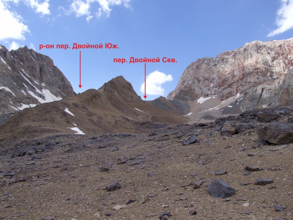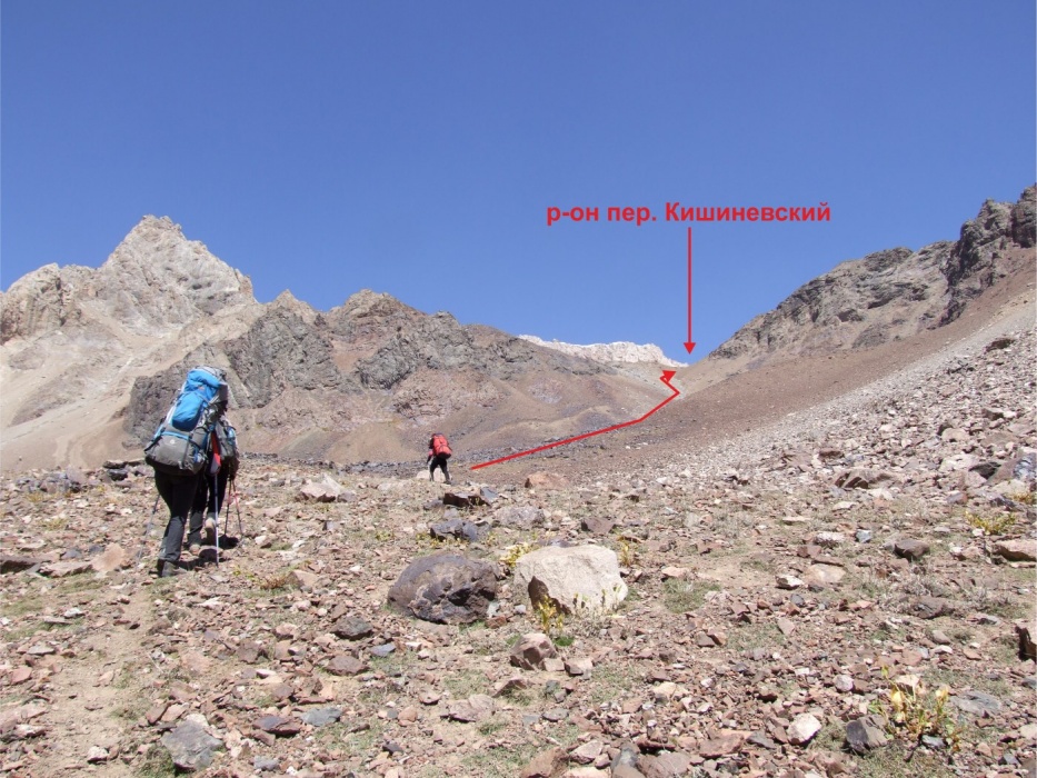 По пологой осыпи выходим к туру пер. Кишиневский. На перевал поднялись в 14:00. Седловина перевала представляет собой огромное осыпное поле. Тур сложен большой, заметный примерно в центре этого поля. Координаты перевала по GPS: 39° 09' 07.39'' N, 68° 11' 19.62'' E. В туре нашли записку от нашей младшей группы от 21.08.2016 г. – у ребят все в порядке. От тура перевала Кишиневский, практически без сброса и набора высоты за один переход подходим под взлет пер. Двойной Сев. Склон осыпной, крутизной до 350 и протяженностью около 100 м. Когда мы подошли к перевалу с него начинала спуск большая коммерческая группа, ребята в большинстве шли неуверенно, медленно, спуская камешки, поэтому нам пришлось с полчаса подождать, пока они закончат спуск.