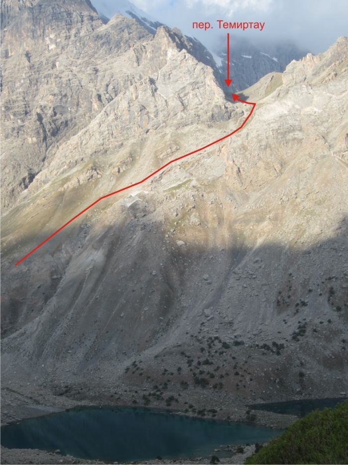 Вышли в 7:35. Подъем простой – обогнули озеро и по некрутому травянисто-осыпному склону начали подъем. Подъем проходит левее седловины, общее направление вправо-вверх, ориентируясь на ложную седловину. По мере подъема открывается настоящая седловина перевала Темиртау, значительно ниже ложной. Скальные выходы на подъеме обходим справа п.х.д., откуда по осыпи совсем близко до перевала. Чуть ниже перевала есть площадки под 2 палатки. У нижней площадки есть вода.