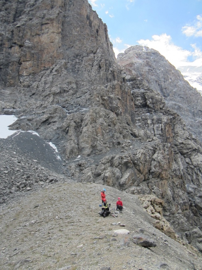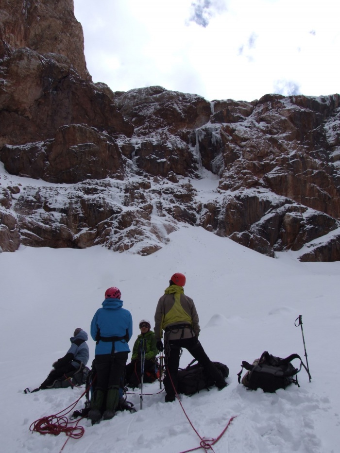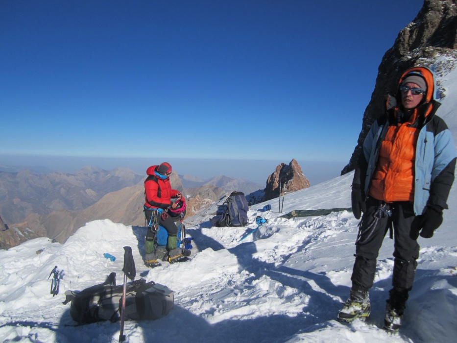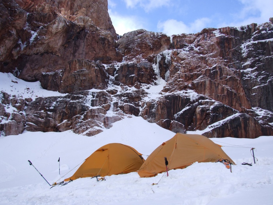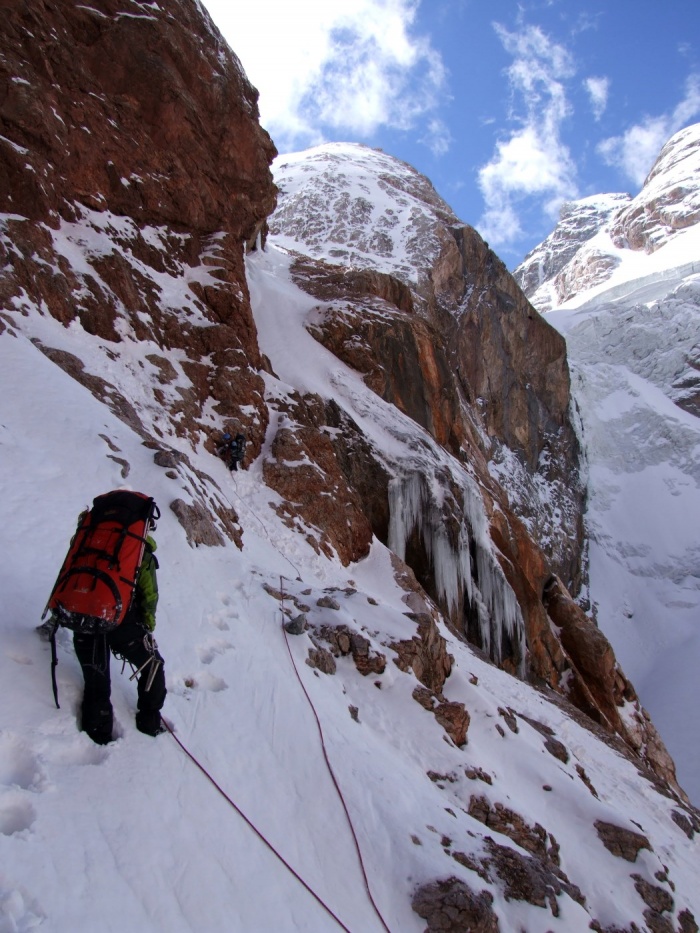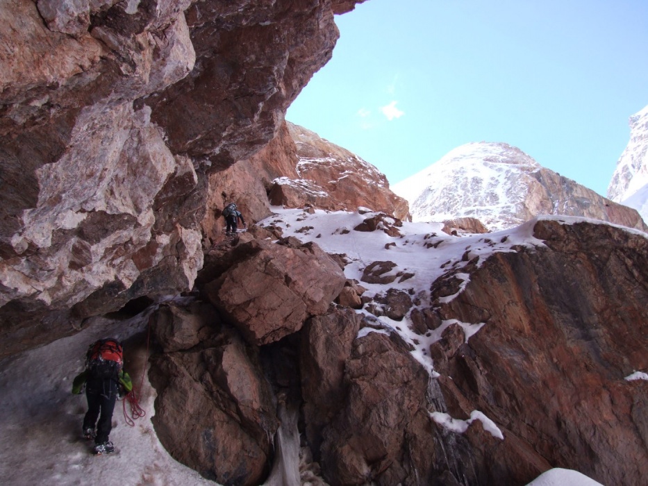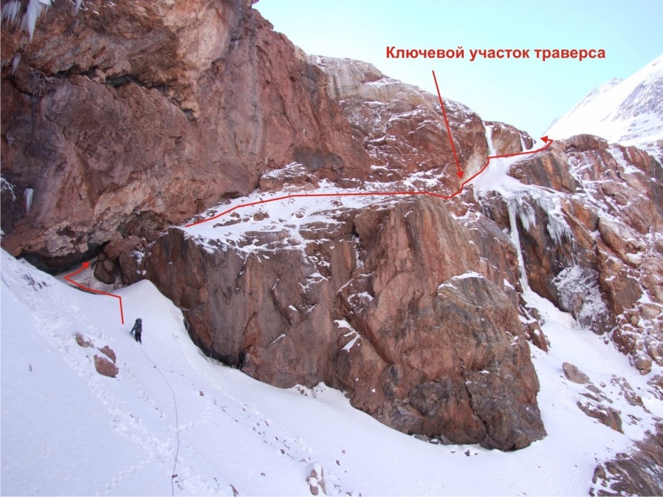 Подъем в 5:00. В 7:00 вышли из лагеря, подошли к намеченному вчера для подъема внутреннему углу. Первый прошел без рюкзака по внутреннему углу прямо вверх, неожиданно легко, непонятно почему вчера здесь сразу не пошли. Промежуточные точки на френдах и закладках, крепление веревки за камень. Остальные поднялись по перилам, рюкзак втащили. Дальше двигаемся по наклонным полкам в связках с одновременной и попеременной страховкой. Подошли к ключевому участку – узкому полуразрушенному карнизу. Первый лезет без рюкзака, страховка на френдах и скальных крючьях, остальные – поднимаются по перилам. Выше ключа еще одна веревка по льду, между скальной стеной и сосулькой замерзшего ручья, страховка на ледобурах. Выше уходим за перегиб в связках и выходим на широкий осыпной склон, ведущий на седловину перевала. Склон завален глубоким снегом. Прохождение технического участка закончили в 12:20.