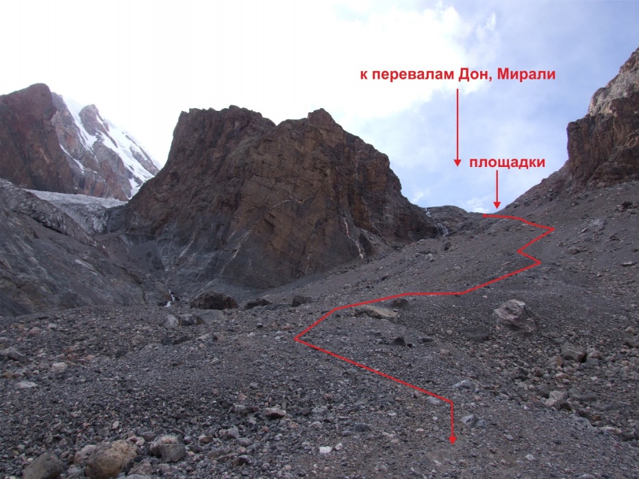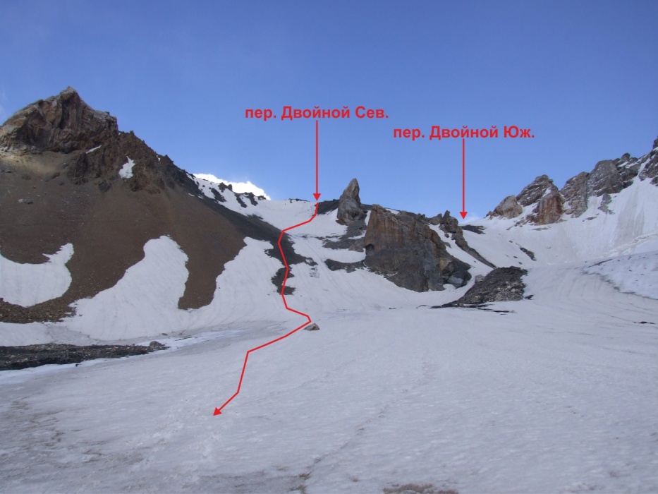 Выйдя на скалы прошли метров 100 и начали спуск по наклонным трещинам. На спуск бросаем две полные веревки, крутизна склона до 650, встречаются старые петли. Спуск привел на широкую осыпную полку. До снежного склона бросаем еще одну короткую веревку – около 10 м. Снежный склон крутизной до 450 в верхней части постепенно выполаживается в верхний цирк пер. Дон. Склон проходим в связках одновременно, сначала лицом к склону, потом просто ногами. Спуск закончили в 13:25. Сбегали на седловину пер. Дон – из цирка за 10 минут поднялись по живой осыпи, присыпанной снегом. Седловина перевала широкая, осыпная, есть готовые площадки под палатки. Тур разобран на половину, записки не обнаружили, свою оставлять не стали.