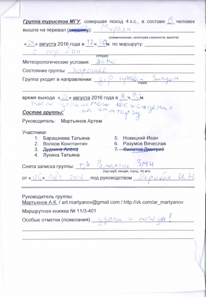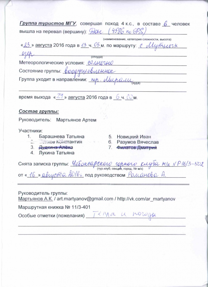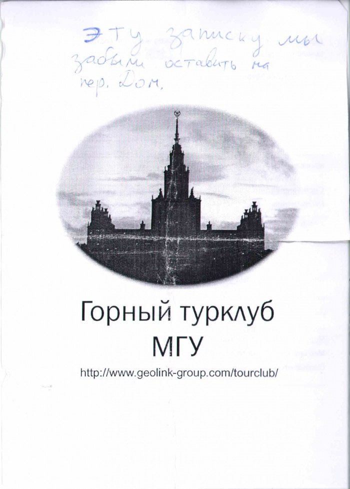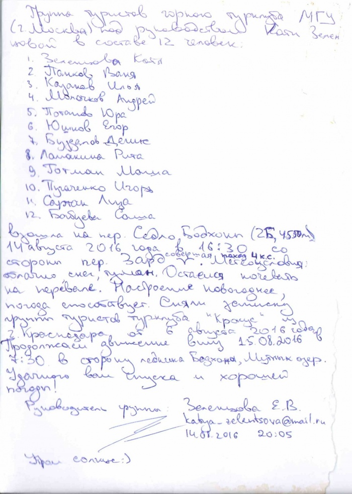 Медленно и печально (сказываются высота и обилие раскисшего снега) поднимаемся на седловину перевала. Седловина широкая, осыпная со скальными выходами, тур находится в самой низкой части гребня, ближе к в. Адиджи. Координаты перевала по GPS: 39° 11' 06.85'' N, 68° 17' 35.38'' E. Группа собралась у тура в 14:00. Сняли записку группы туристов т/к МГУ, г. Москва, совершавших поход 4 к.с., под руководством Зеленцовой Екатерины, от 14.08.2016.