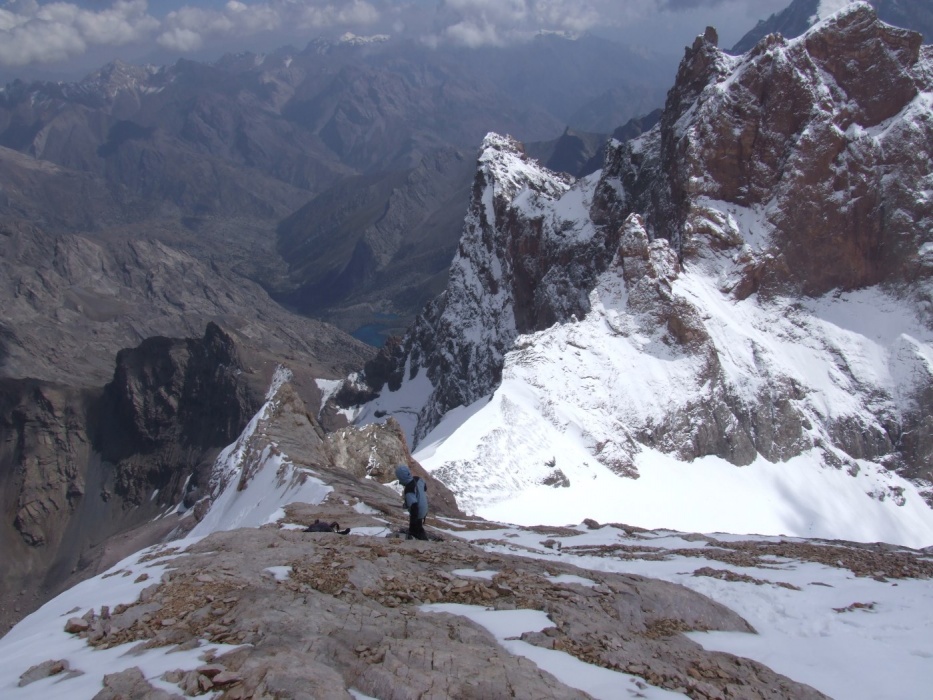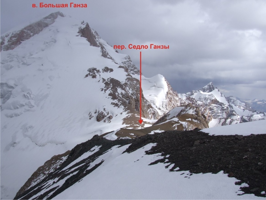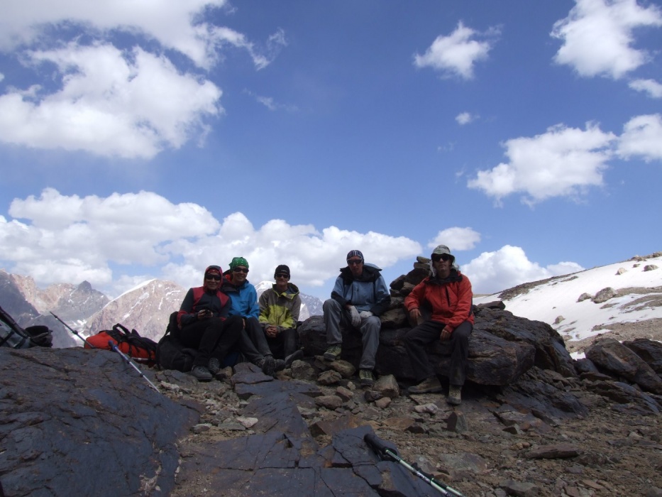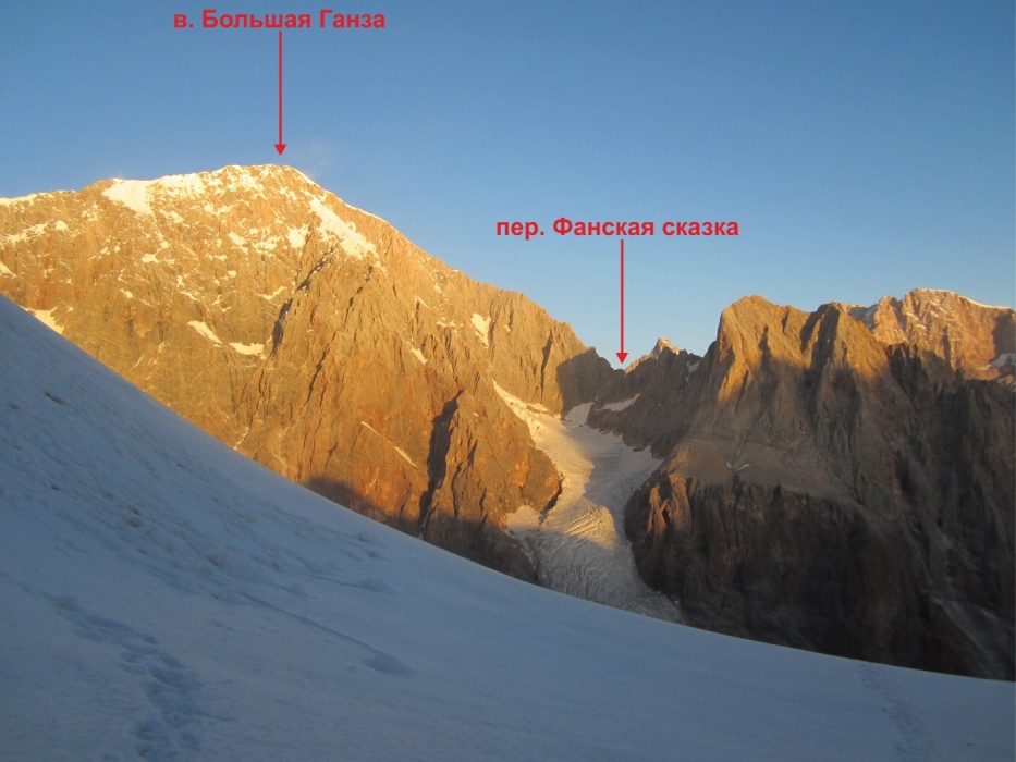 Сняли записку группы туристов г. Киева, совершавших поход 6 к.с., под руководством Монсара О.А. от 22.08.2007 г. По-видимому, группы, проходящие перевал в обратном направлении, оставляют записки в другом туре, который сложен в месте подъема на гребень с противоположной стороны, искать этот тур мы не стали. Координаты перевала по GPS: 39° 08' 55.58'' N, 68° 21' 21.91'' E. С южной стороны перевала на гребне есть места под палатки, но нам там показалось недостаточно комфортно – тесно и ветрено. Поэтому мы поставили лагерь, выкопав площадки в снегу, под скалами, с северной стороны перевала. Весь день стояла замечательная погода. С перевала открывается хороший вид на Большую Ганзу и пер. Фанская сказка.
