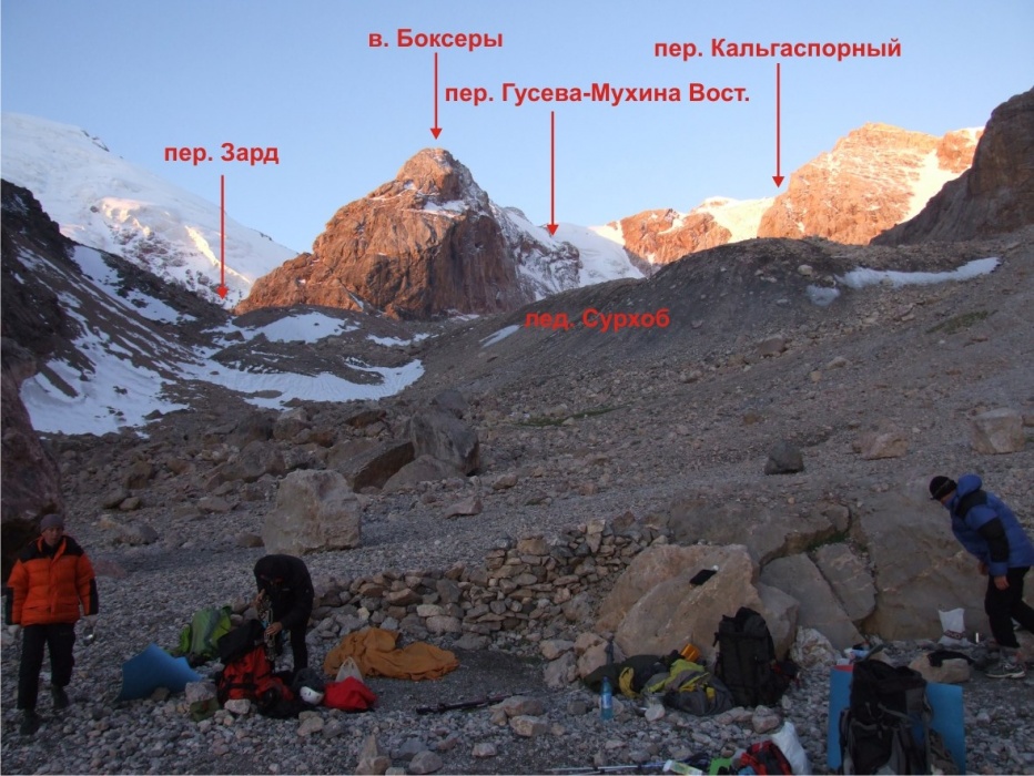 День 7. 20.08. р. Сурхоб – лед. Сурхоб – пер. Гусева-Мухина Вост. (2Б, 4700м, лд.) – пер. Седло Ганзы (2Б, 4400м, ск.-лд.)