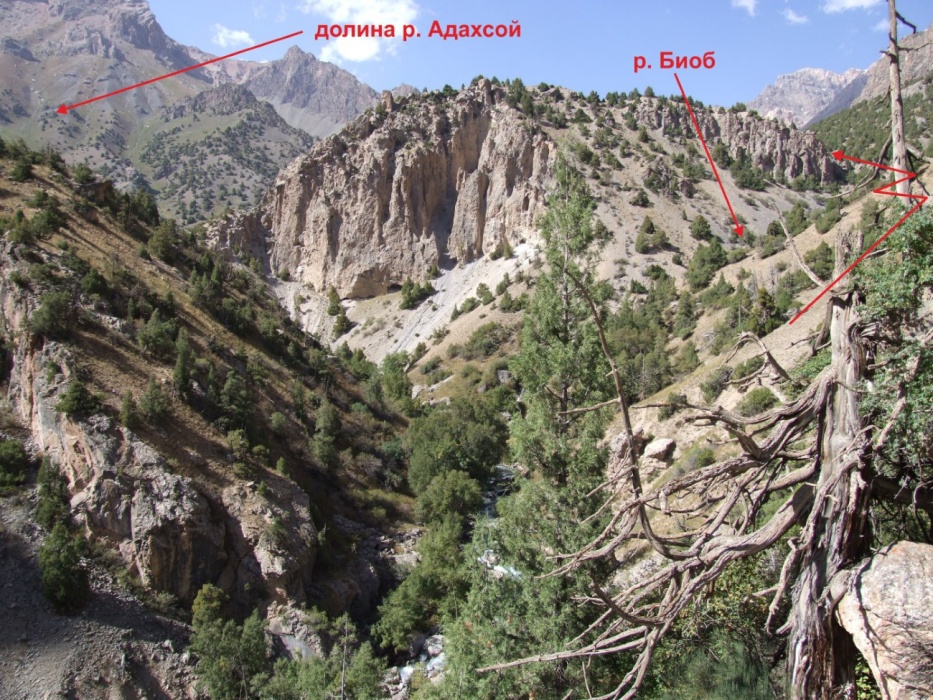 В час дня остановились на обед напротив впадения р. Чапдара. После обеда продолжаем движение по левому берегу. Здесь долина сужается в каньон, а тропа поднимается высоко на склон. Подходим к слиянию рек Биоб, Казнок и Ахдасой. Главным ориентиром служит большой холм-утес с крутыми стенами и плоской верхушкой. Подъем проходит как показано на карте: сначала вправо вдоль р. Биоб, затем переправа через реку и выход на вершину холма. На плоской вершине стоят старые заброшенные водомерные метеорологические приборы и устроен кош.