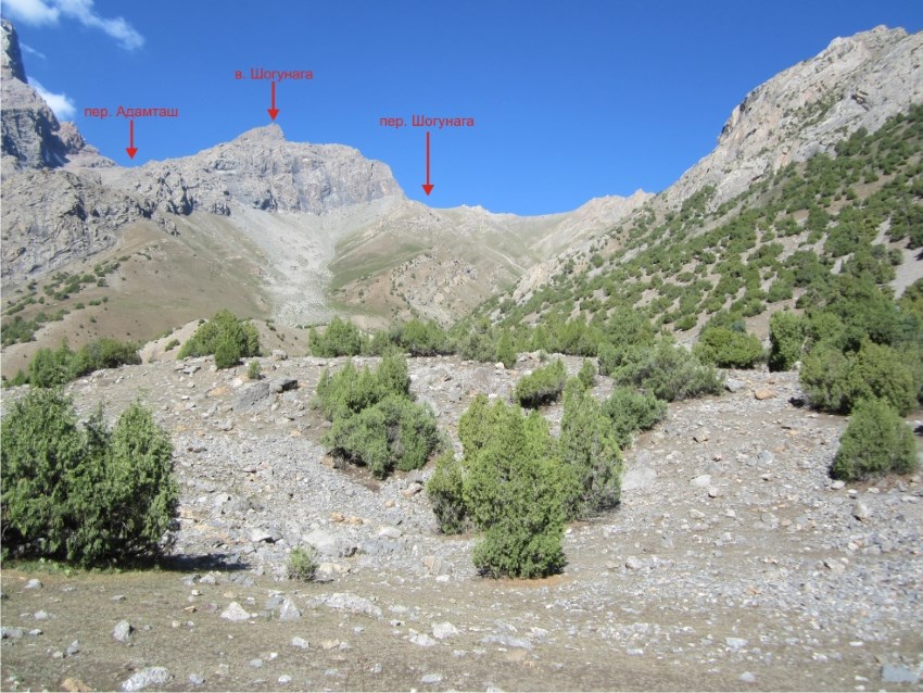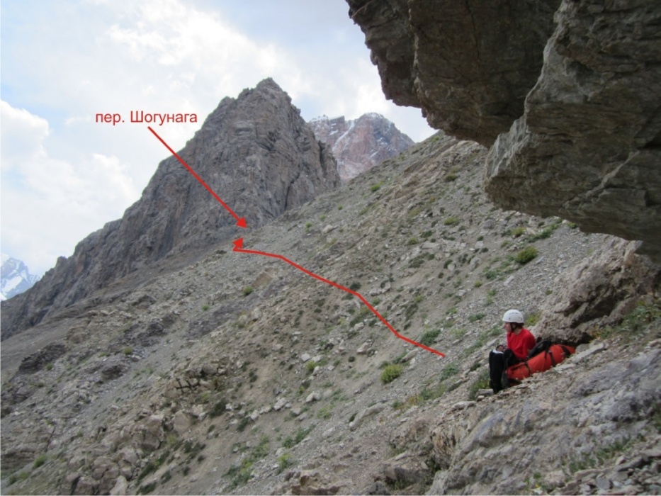 По средней подвижной осыпи в 13:20 выходим на перевал. Седловина перевала осыпная широкая, тур расположен под скалами в. Шогунага. Координаты перевала по GPS: 39° 13' 57.78'' N, 68° 13' 35.11'' E. Сняли записку группы туристов турклуба УрФУ, г. Екатеринбур, совершавших горный поход 2 к.с. от 10.09.2015 г., под руководством Митрясова Олег. Площадок под палатки, воды в каком-либо виде на перевале нет. Несмотря на испортившуюся погоду – сильный ветер, облачность, начинающийся дождь со снегом, на перевале провели около часа. Поздравили начинающих туристов-горников с первым перевалом, съели положенную перевальную шоколадку, фотографировались со всех сторон. Вид с перевала ограничен скальным массивом в. Шогунага. Видны Алаудинские озера, Чапдара, часть Куликалонской стены с перевалом Дон.