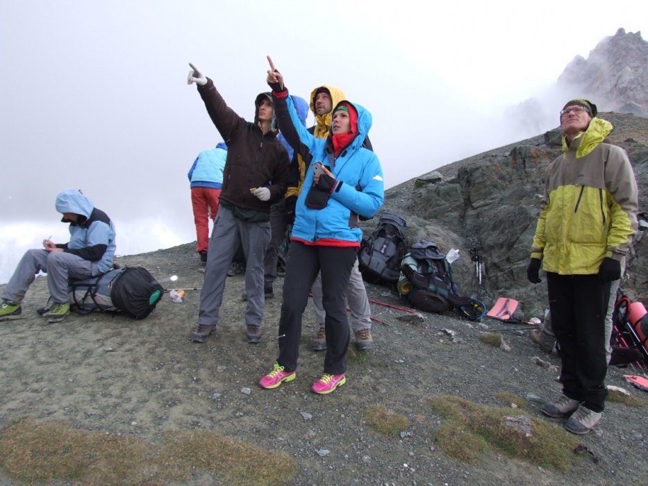 На перевале группа собралась в 15:00. Седловина перевала небольшая осыпная. Тур по центру перевала, рядом с большим валуном. Координаты перевала по GPS: 39° 09' 40.86'' N, 68° 17' 58.48'' E. Сняли записку группы туристов т/к «Спутник», г. Уфа, совершавших поход 5 к.с., под руководством Валиева А.Ш. от 12.08.2016 г. Готовых площадок на перевале нет, но при необходимости можно переночевать. Погода опять плохая – видимости нет, идет снег.