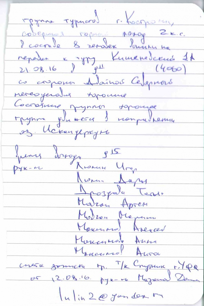 Единственным изменением запланированного маршрута было прохождение перевала Кишиневский (1А) вместо перевала Челябинский (1Б). При подготовке похода удалось собрать крайне скудную информацию по перевалу Челябинский, у нас отсутствовали фотографии и описание вариантов подъема. Из долины р. Адахсой перевальная седловина четко не читалась. Из-за создавшегося на тот момент дефицита времени не было возможности обследовать участок хребта, выясняя какое именно понижение является перевалом. В результате было принято решение пройти соседним, более посещаемым перевалом, подъем на который со стороны долины р. Адахсой оказался более логичным.