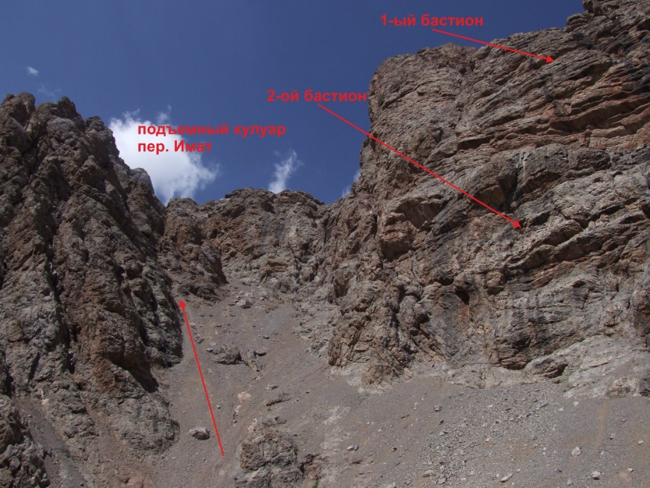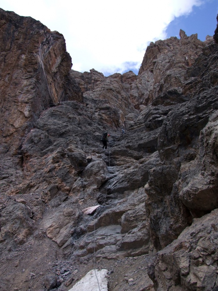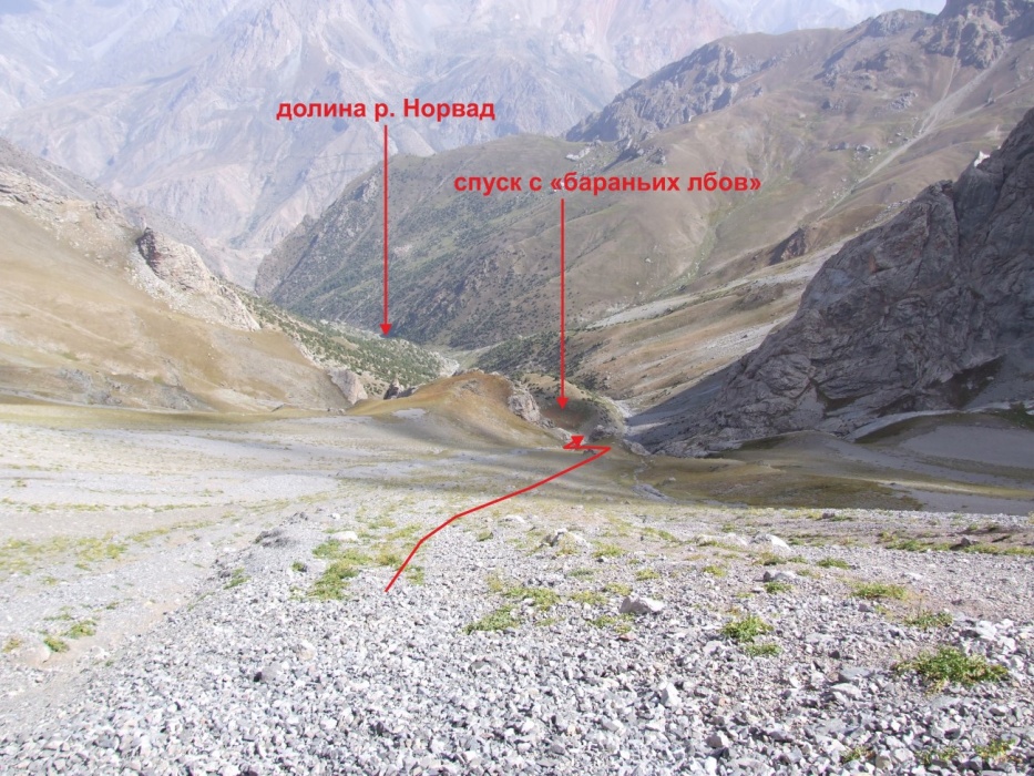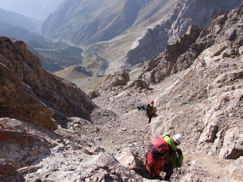 После спуска проводим небольшую разведку. Наиболее простой спуск нам показался левее. Траверсируем скалы с гимнастической страховкой, далее придерживаясь руками за веревку спускаемся в широкий, сужающийся к низу «бутылкой» осыпной кулуар. Здесь еще одна разведка. Спуск прямо вниз нам не понравился – кулуар, как воронка собирает все, что летит сверху, а в низу еще около 20 м отвесных скал. Поднимаемся метров на 20 влево пешком на достаточно широкую седловину, здесь кто-то построил площадку под палатку. С седловину спуск вниз по осыпному склону, выводящему к широкой светлой осыпи у подножия стены. В тучах пыли, от этой осыпи сбегаем вниз, к бараньим лбам – прохождение перевала закончено. На спуск провешено 4 полные веревки и одна короткая. Спуск закончили в 14:30.
