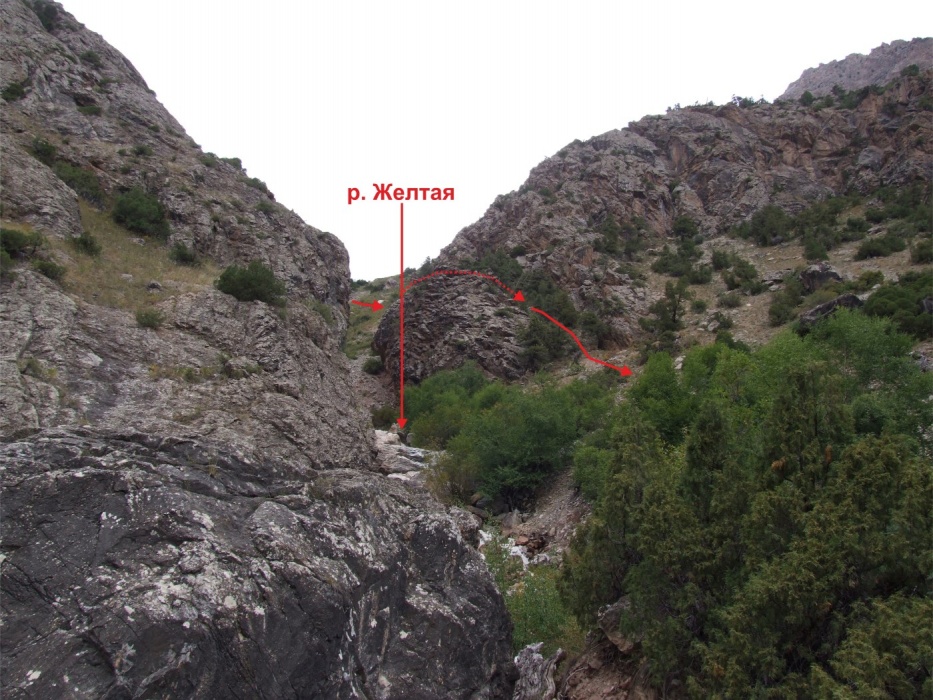 После бергшрунда склон выполаживается. В связках проходим закрытую часть ледника и в 12:00 останавливаемся убрать веревки и перекусить. После еды идем по открытому леднику, обходя трещины ближе к правому борту. Ледник проходим за один переход. Выход с ледника на оконечную морену проблем не представляет. Убираем кошки, и продолжаем движение по левому берегу р. Желтая. Тропы нет, но идти не сложно. По крупной и средней осыпи, травяным склонам за два перехода подходим к каньону р. Желтой. По дороге прошли развалины коша, кое-где встречаются непонятные фрагменты троп.