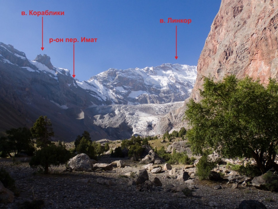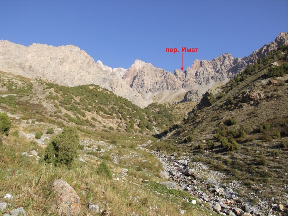 Сегодня полудневка, поэтому с утра никуда не спешим. Погода хорошая. Занимаемся стиркой, просушкой, ремонтом снаряжения, отдыхаем. В 13:00 выходим. Движемся левым берегом р. Имат. Выше по течению по каменным завалам перебираемся через реку и начинаем подъем по склону боковой морены. Подъем неприятный – крутой жесткий конгломератный склон. Как потом оказалось, удобнее было бы подниматься левее, в кармане между мореной и склоном. На верхушке моренного гребня, перед выходом на ледник есть готовые площадки под палатки. С вершины моренного гребня выходим на открытый ледник разорванный ледник. По леднику подходим под перевальный взлет и в 16:40 на более-менее ровном участке начинаем ставить лагерь. Остаток светлого времени наблюдаем за перевалом, намечая на завтра путь подъема.