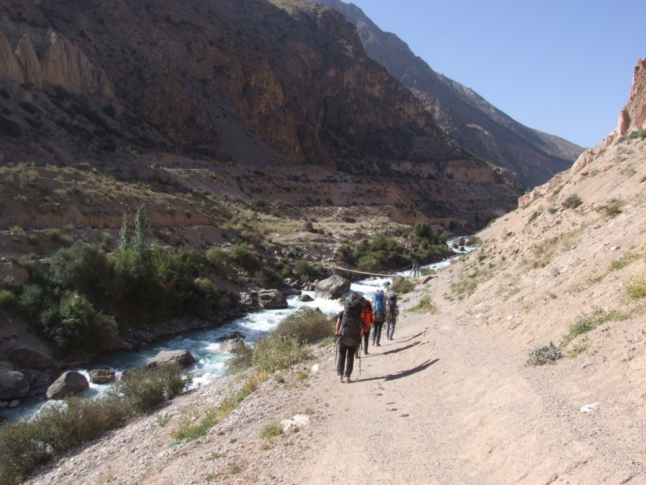 Подъем стандартно в 5:00. Самочувствие Саши в норме, немного разгружаем ее, в 7:00 выходим. По тропе доходим до слияния ручьев. Далее идем по тропе правым берегом р. Норват. Местами тропа размыта, приходится пробираться по прижимам над самой водой. У коша по хорошему мосту переходим на левый берег. Отсюда до самого поселка идет широкая набитая тропа. За 1,5 часа дошли до пос. Нарвад. Прошли поселок и вышли к пешеходному подвесному мосту через р. Искандердарья на южной окраине. Погода стоит хорошая. Здесь, внизу, прямо с утра просто жарко. На другой стороне проходит асфальтовая дорога до Искандеркуля.