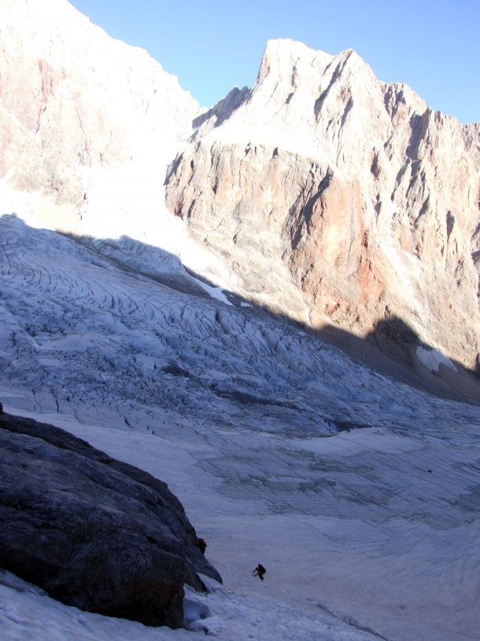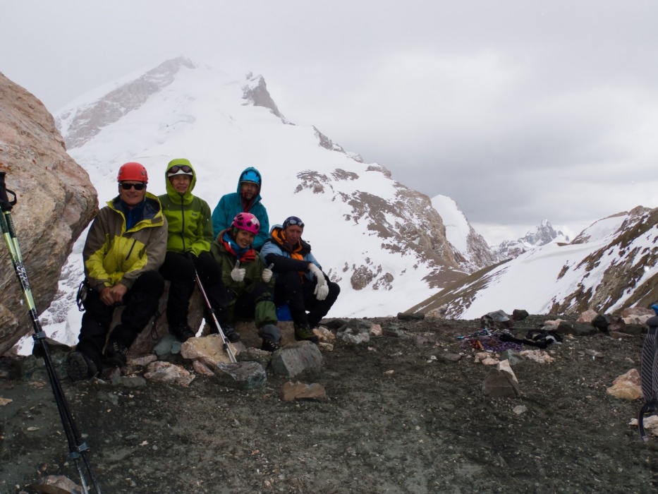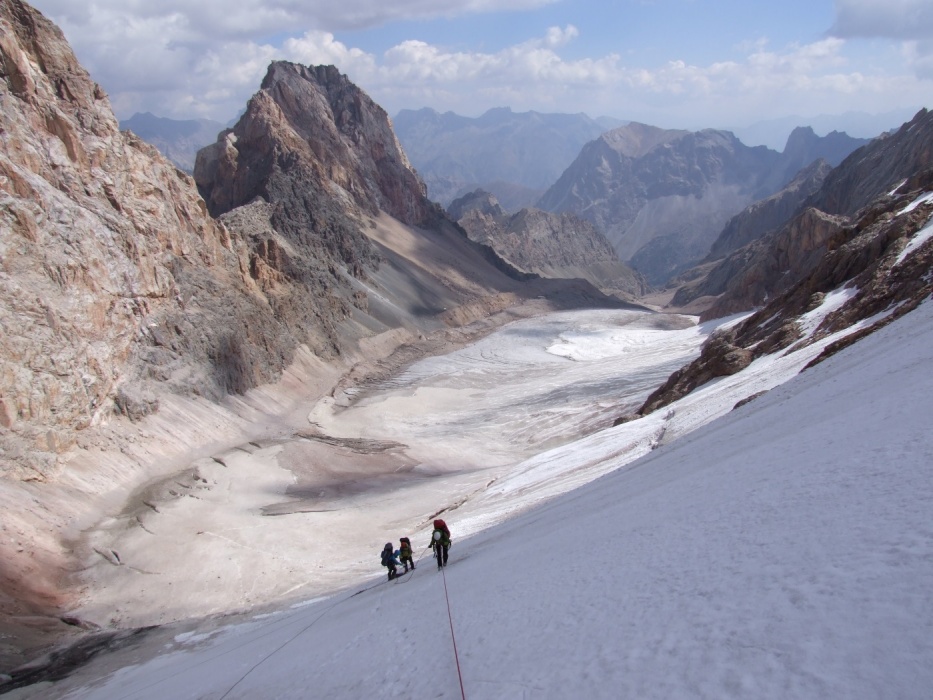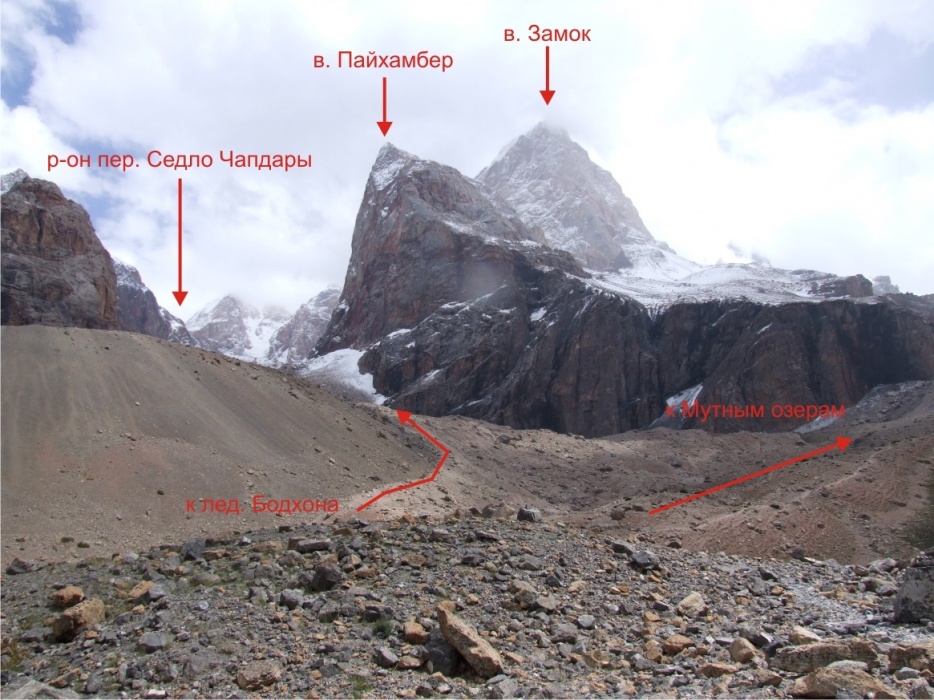 Подъем сделали ранний в 4 утра. Погода с утра хорошая, ясно, тихо, только у вершин небольшие облака, температура ниже нуля – вся вода замерзла. Вышли в 5:30. Немного приспустились с морены, котловину обогнули справа п.х.д, под стенами в. Пайхамбер. По заваленным снегом моренам выходим на ледник, приходится тропить по очереди. На леднике свежего снега стало еще больше, встречаются полузасыпанные трещины. Продолжаем движение одной связкой, придерживаясь середины ледника. Прижиматься к стенам опасно, после того, как солнце осветило склоны, со стен Замка пошли неслабые лавины.