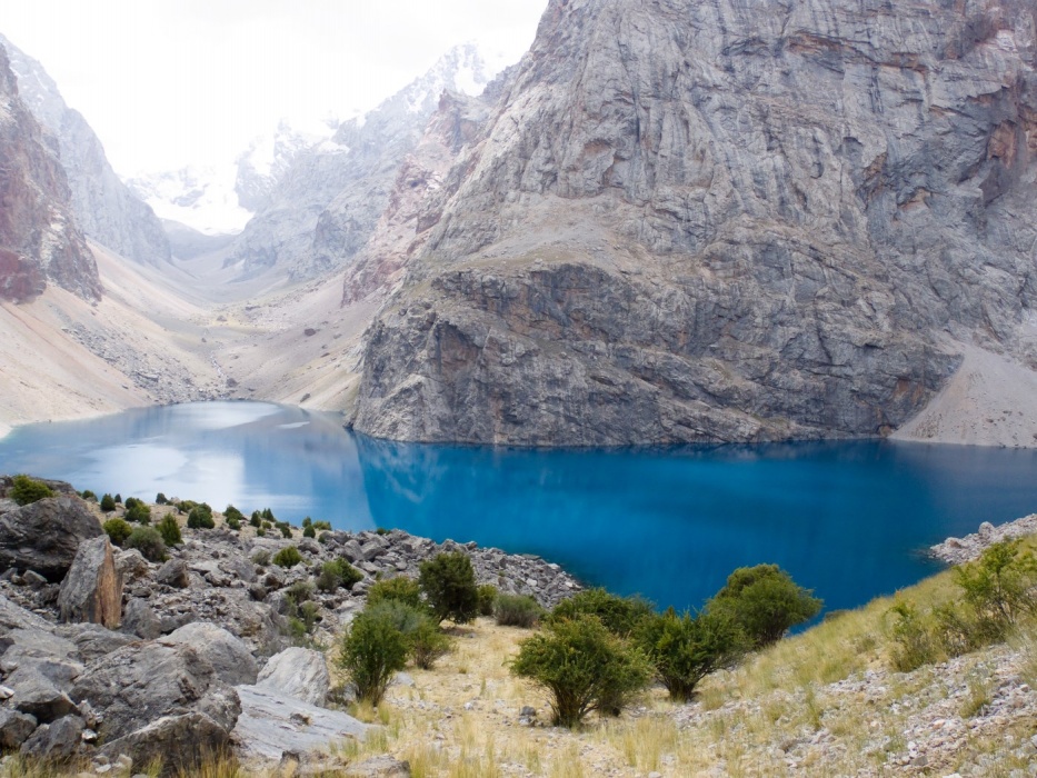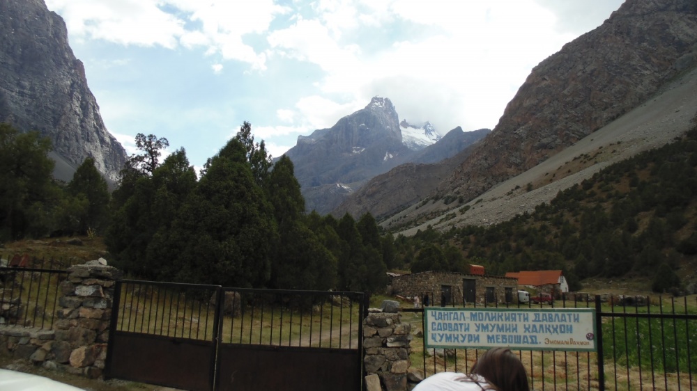 Двинулись по дороге, которая, к счастью, с утра находится в тени скал. В начале серпантина нас подобрал КАМАЗ, который шел вверх за сеном. В кузове КАМАЗа доехали до шлагбаума у моста, где Искандердарья вытекает из озера. Здесь у нас проверили пропуска в заповедник. От моста за 10 минут дошли до турбазы. Мы рассчитывали забрать заброску, пообедать, перепаковаться и идти дальше, поскольку уже выбивались из графика, но на турбазе нашей заброски не оказалось. После нескольких часов поисков и попыток связаться альплагерем, нам все же удалось дозвониться и выяснить, что заброску нашу благополучно забыли, но в течение двух часов обязательно привезут. Понимаем, что сегодня двинуться дальше не получиться и решаем ночевать на территории турбазы. Через пару часов и вправду привезли нашу сумку. Обедаем, стираемся, моемся, перепаковываем продукты и газ. Вечером отдыхаем, наслаждаясь потрясающими видами Искандеркуля.