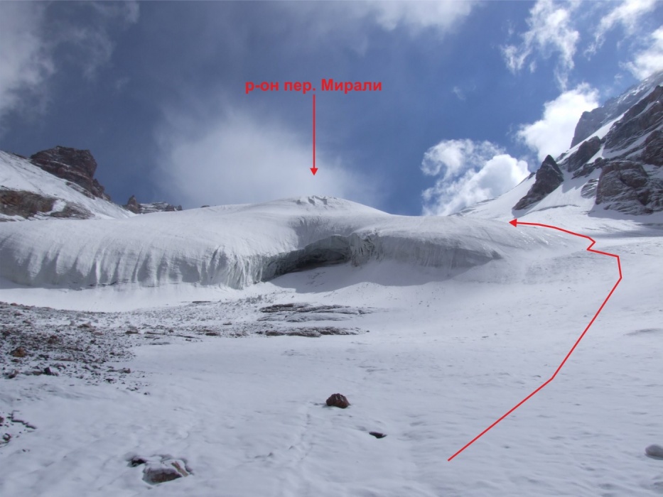 На перевал поднялись в 15:15. Перевальная седловина широкая, снежная, с одной стороны ограничена скалами в. Мирали, с другой снежным склоном, ведущим к скальному поясу Чимтарги. Со стороны Алаудинских озер висят большие карнизы. Тур расположен в северной части гребня под в. Мирали. Координаты перевала по GPS: 39° 12' 34.92'' N, 68° 12' 03.66'' E. В туре нашли две записки, одна с этого перевала, а другую забыли оставить на пер. Дон. Записка группы туристов МГУ, г. Москва, совершавших поход 4 к.с., под руководством Мартьянова Артема от 26.08.2016 г, записка группы туристов МГУ, г. Москва, совершавших поход 4 к.с., под руководством Мартьянова Артема от 23.08.2016 г. Ближе к скалам на гребне нашли занесённые площадки, откопали их, надстроили ветрозащитные стенки. Борясь с ветром растянули палатки. Метель продолжался до захода солнца. На закате ветер стих, облака начали расходиться, и мы воочию смогли увидеть многократно описанные фантастические краски заката.