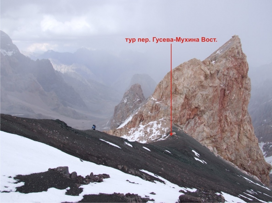 В 9:30 поднялись на перевал. Погода испортилась окончательно: идет снег, видимость есть, но над вершинами клубятся плотные тучи, иногда слышен вдали гром. Перевальная седловина широкая осыпная. Тур расположен рядом с тропой. Координаты перевала по GPS: 39° 14' 57.12'' N, 68° 13' 39.26'' E. Младшая группа первой подошла к туру, поэтому забрал у них записку, а в тур положил свою.