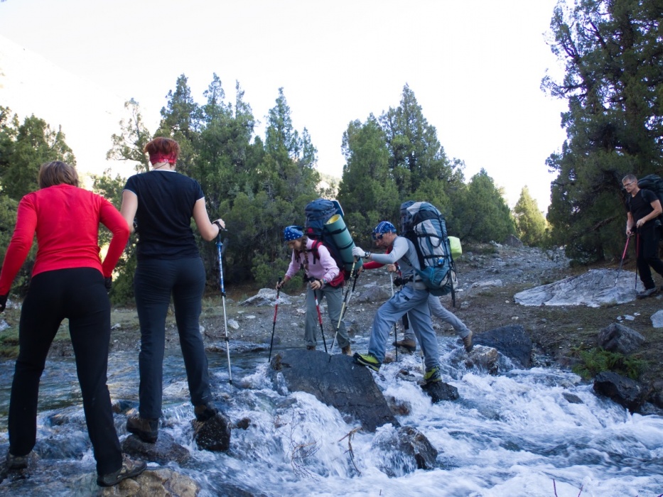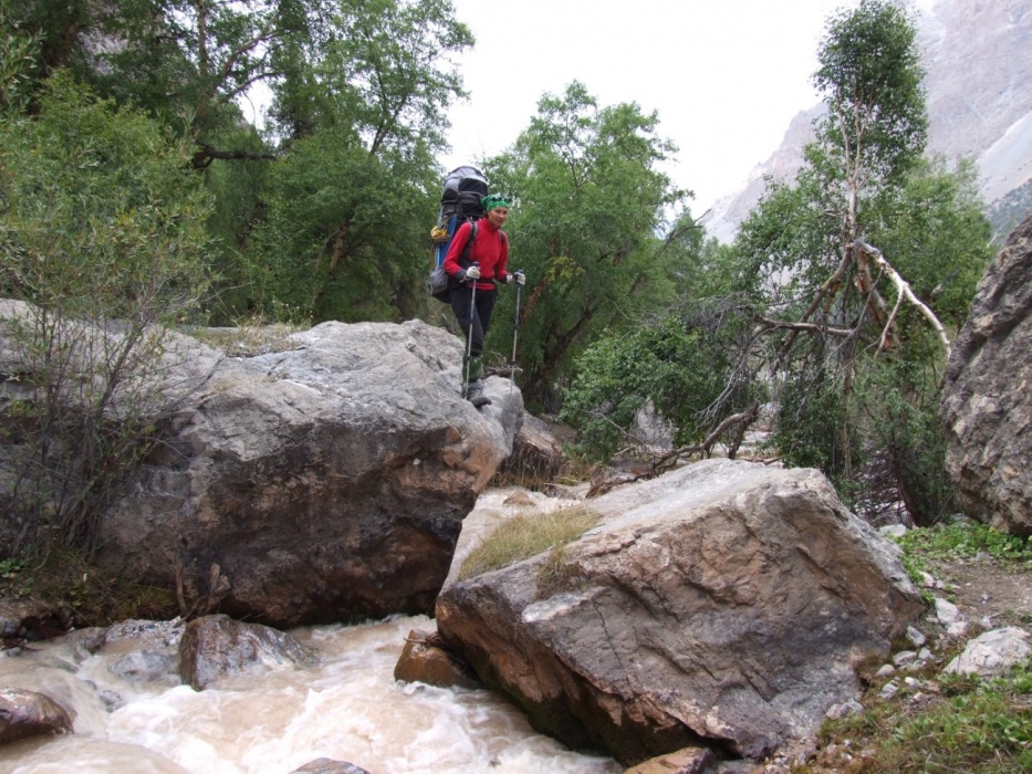 Подъем в 5:00. Погода хорошая, ясно. Собираемся бодро, но немного тормозит «младшая» группа. Вышли из лагеря в 7:20. Перебираемся через речку в лагере, выходим за территорию, и по тропе начинаем подъем на первый моренный вал, перегораживающий долину. Рюкзаки не тяжелые, тропа хорошая, но идем не быстро, большинство впервые в Фанах (а кое-кто из «малышей» и вообще в горах в первый раз), поэтому ребята поминутно хватается за фотоаппараты. После подъема переходим по камням еще один поток, воды много.