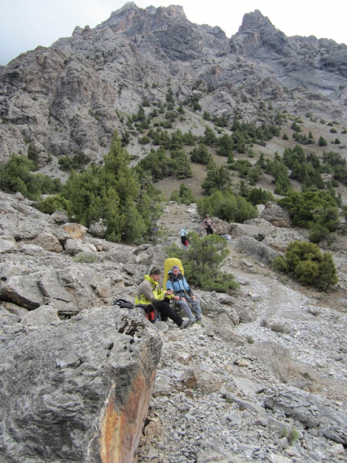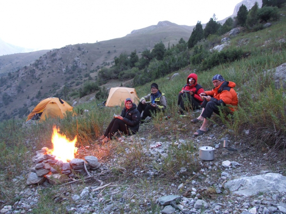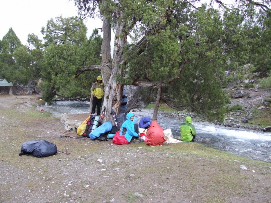 Ближе к вечеру к нам в лагерь пришел местный лесник. Разрешение на посещение заповедника, купленное в «Вертикаль-Алаудине» в долине Куликалона не действительно, поэтому лесник стал требовать плату за посещение. Объяснили ему, что наутро уходим назад в альплагерь и больше здесь не появимся поторговались и договорились на половину суммы. Большую часть вечера идет дождь, поэтому сидим по палаткам.