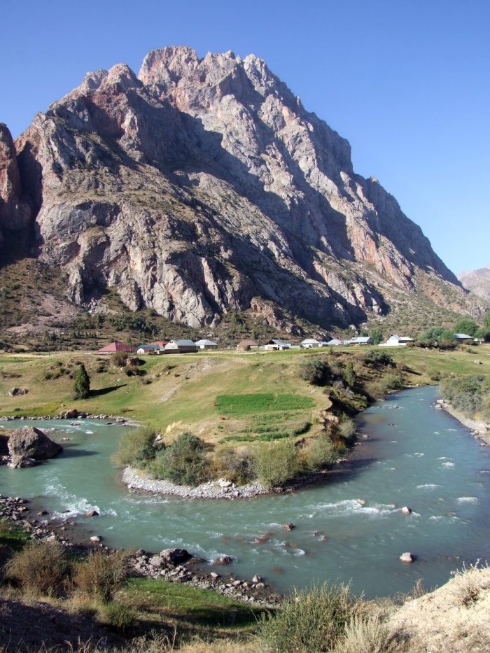 Подъем в 5:00. Вышли в 7:00. Погода замечательная. Идем по дороге вдоль западного берега Искандеркуля. За озером нас нагнал пустой грузовик, который подбросил нас почти до пос. Сарытаг. Около 8 утра подошли к мосту через р. Сарытаг. Поселок расположен на противоположном правом берегу реки. Мы же мост не переходим и идем тропой по левому берегу. В 8:40 подошли к слиянию рек Сарытаг и Арх и повернули в долину Арха.