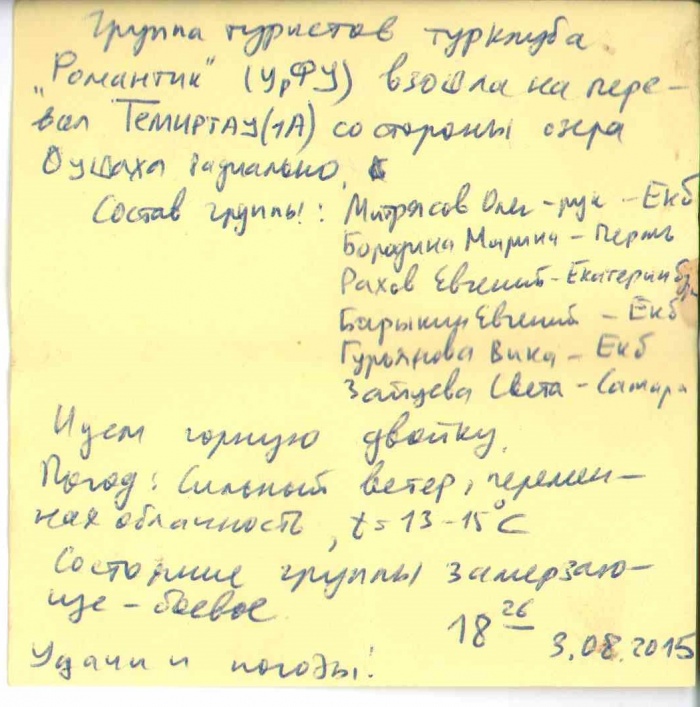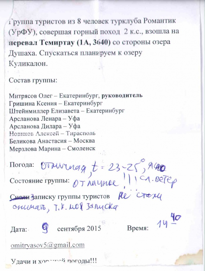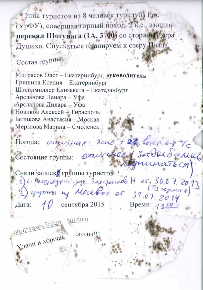 В 10:30 поднялись к на перевал. Координаты перевала по GPS: 39° 13' 57.52'' N, 68° 11' 06.48'' E. В туре было 2 записки. Последняя по времени 09.09.2015 г. группы туристов турклуба «Романтик» УрФУ, г. Екатеринбург, совершавших горный поход 2 к.с., под руководством Митрясова Олег.