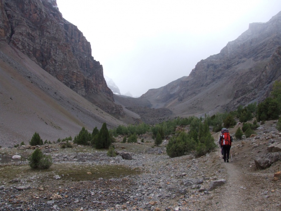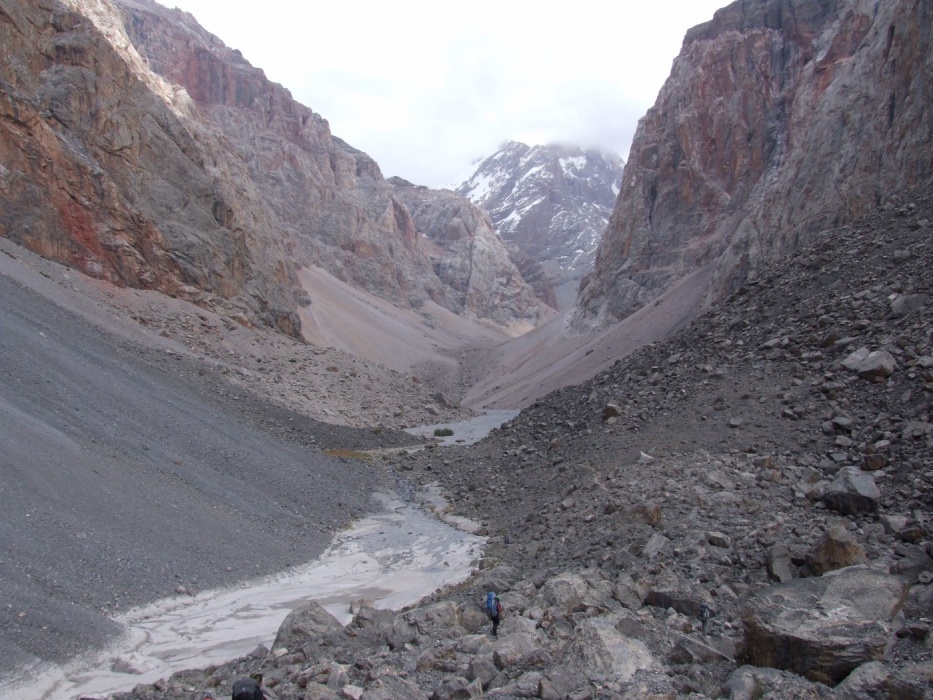 В 11:10 выходим от озера Подъем в долину р. Правый Зиндон начинаем по громадному каменному завалу. Минут через 15 хода находим хорошо набитую, маркированную турами тропу по которой поднимаемся на первую ступень долины. Проходим длинный галечный пляж, по которому протекает река. В конце пляжа, перед подъемом на вторую ступень долины, устраиваем перекус. Наши опасения по поводу погоды, увы, оправдываются – небо затягивают тучи, временами идет мелкий дождь. После перекуса поднимаемся по тропе на моренный вал, перегораживающий долину, тропа идет по правому берегу реки. Еще за один переход подходим под начало подъема к перевалу Мирали. На площадках у подъема на перевал встали в 14:05. Начинается снег, гроза. Непогода не прекращается до вечера.