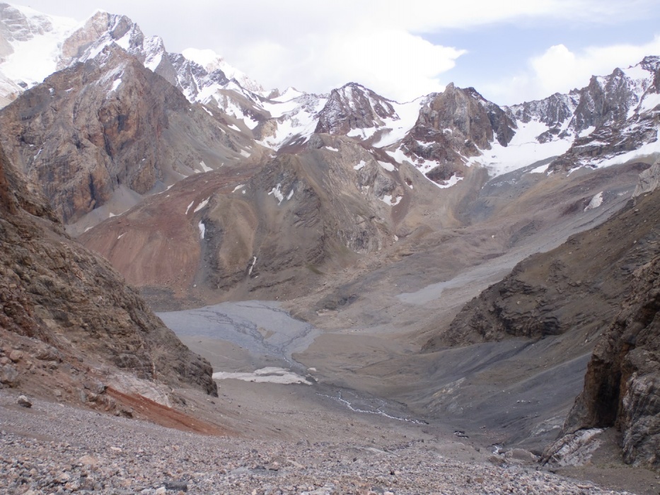 Погода гораздо лучше вчерашней, несмотря на тучи, и снежные заряды, видимость хорошая. С перевала открывается вид на в. Большая Ганза, в. Замок, пер. Фанская сказка, пер. Енисей. По простому снежному склону можно подняться на в. Адиджи. При необходимости на перевале можно ночевать, есть готовые площадки под палатки. Воды нет, только снег. Спуск с перевала в долину р. Сурхоб начали в 14:50. Спускаемся пешком, сначала по снежникам, потом по мелкой и средней осыпи. На ночевку встали в 16:40 на замечательных галечных площадках под оконечной мореной ледника Сурхоб.