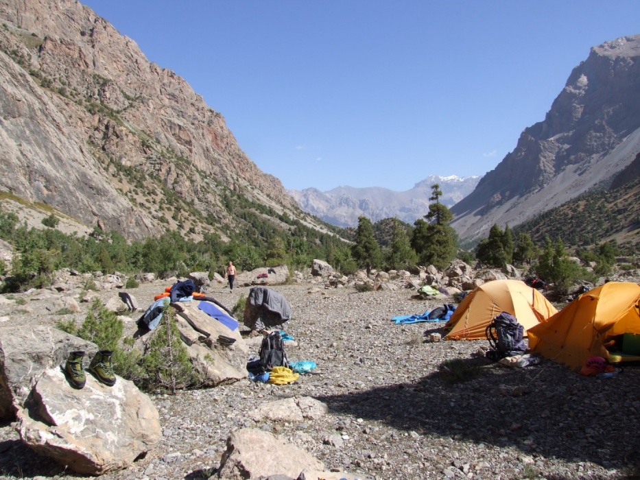 До пос. Сарвада отличная асфальтовая дорога, построенный тоннель здорово сокращает путь. В Сарводе оставили заброску – ее должны позже переправить на т/б «Искандеркуль». От поселка до альплагеря идет грунтовка, в нашем случае ее состояние было вполне удовлетворительное. Всего путь от Худжанта до а/л «Вертикаль-Алаудин» занял около 6 часов. В 5 вечера мы были в лагере. В лагере нас встретил Александр Крейцберг. Познакомились, кто еще не был знаком, показал нам места под наши палатки. Александр огорчил нас, сказав, что погоды в этом сезоне нет, и что вряд ли стоит рассчитывать на ее улучшение. Оставшуюся часть дня улаживаем необходимые дела: оставляем документы для регистрации, МЧС, расплачиваемся за предоставленные услуги, обмениваемся с телефонами с руководством лагеря, распределяем заброску.
