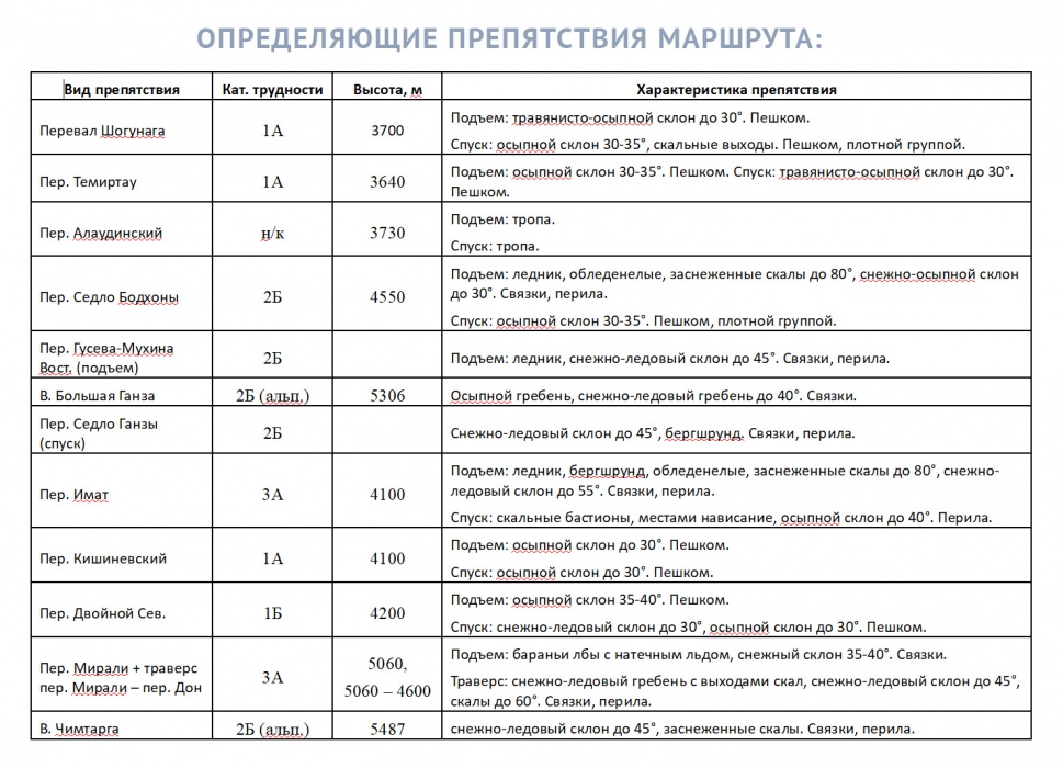 За 20 ходовых дней нами было пройдено 9 перевалов из них 3А – 2 шт (включая связку перевалов и траверс гребня пер Мирали. – пер. Дон), 2Б – 3 шт., 1Б – 1 шт., 1А – 2 шт., н/к – 1 шт., совершено восхождений 2Б (альп.) – 2 шт.Большое количество снега и сложные погодные условия повысили сложность прохождения перевалов. Особенно это сказалось при подъемах на пер. Седло Бодхоны, пер Мирали, а также при восхождениях на вершины Большая Ганза и Чимтарга. Погода во время похода оставляла желать лучшего. Лишь несколько дней в середине похода были без осадков. Снег, дождь, отсутствие видимости снизили темпы прохождения, но, в целом не повлияли на результаты похода. Поход получился умеренно технически и физически напряженным, без нештатных ситуаций, соответствующий заявленной категории трудности. План похода выполнен группой в полном объеме.