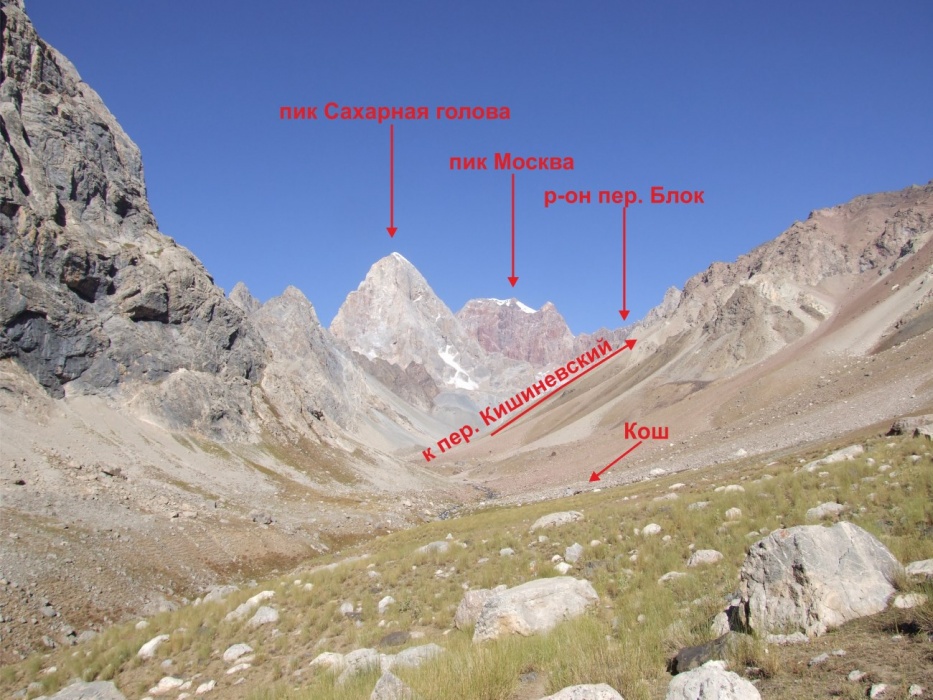 Подъем в 5:00. Вышли в 7:00. Продолжаем движение вверх по долине. Еще один подъем и вышли на пологую часть долины. Впереди возвышаются пики Москва и Сахарная Голова. За два перехода дошли до коша. Пастуха в коше не было, стадо виднелось далеко на склоне, но нам на встречу выскочили две здоровенные собаки. Камнями и трекинговыми палками удерживали их на расстоянии, пока проходили мимо коша. Выше коша долина разделяется. Заметив нас издали, к нам подошел пастух, попросил что-нибудь от зубной боли.