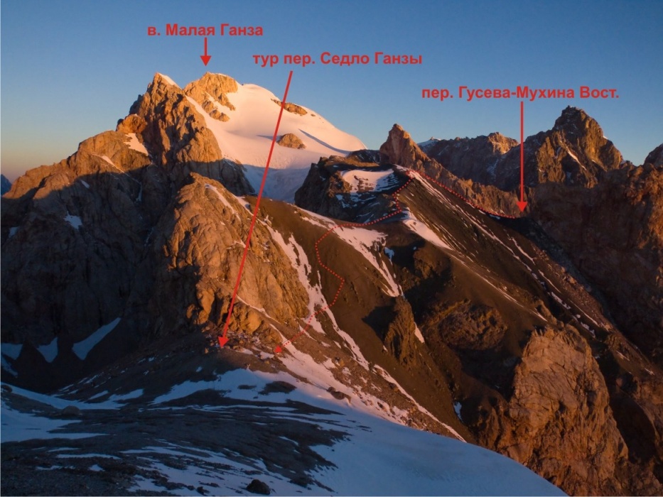 От тура по черной сыпухе поднимаемся около 50 м на основной гребень. На гребне поворачиваем влево п.х.д. Сначала движемся по гребню, потом немного спускаемся на склон, чтобы обогнуть скальный массив и минут за 20 спускаемся на пер. Седло Ганзы. На перевал вышли в 16:30. Перевальная седловина – широкое осыпное поле. Тур расположен под скалами, на противоположной стороне от начала гребня, ведущего к вершине. Координаты перевала по GPS: 39° 09' 20.79'' N, 68° 18' 06.30'' E. Сняли записку группы туристов т/к МГУ, г. Москва, совершавших поход 4 к.с., под руководством Мартьянова Артема от 18.08.2016 г. Рядом с туром есть пара мест под палатки, на которых мы и поставили свой лагерь. Еще очень много площадок под палатки построено на пологом осыпном юго-западном склоне, чуть ниже перевала. На перевале отлично работает сотовая связь.