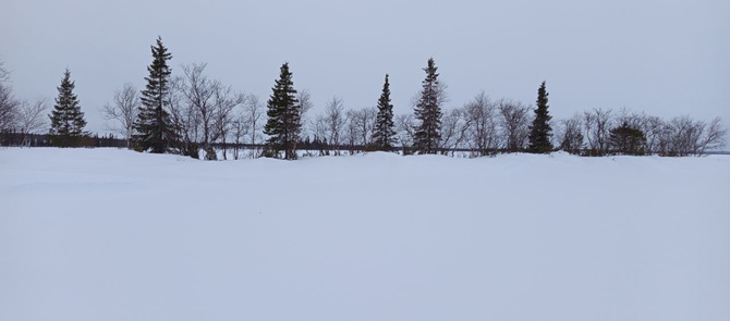 Скоро озеро заканчивается и думаю как идти дальше. По плану – надо прорываться сквозь густые кусты на Контозеро. И как вариант – выходить на берег и идти по болотам, что обозначены на топокарте навигатора, вперёд. Вспоминая утреннюю эпопею по петлянию в кустах, выбор делаю в пользу болот, которые угадываются по заметённым моховым кочкам и багульнику. Впереди недалече темнеет лес, и там выделяются рослые сосны. Пользуюсь ими как ориентиром, на который я держу свой курс. Последние сосны я видел наверное числа 7 марта, дней десять назад. И вот теперь снова появляются сосны и ёлки, изредка на пути под ногами встречаются небольшие хвойные… Суровая тундра постепенно опушается древесной растительностью.