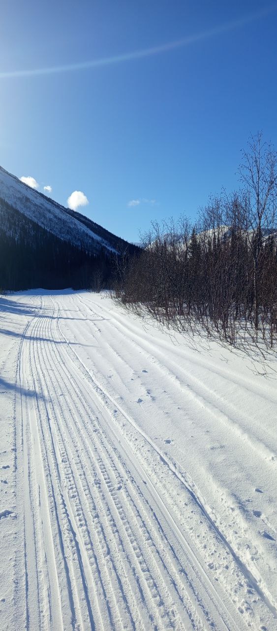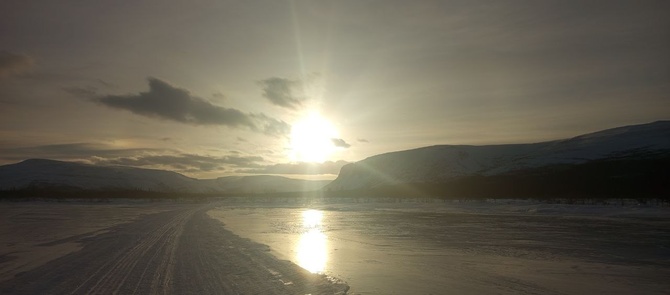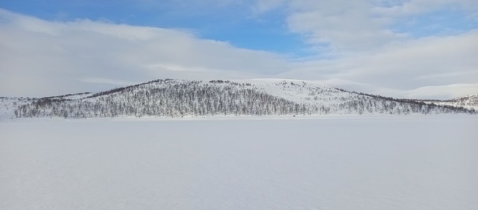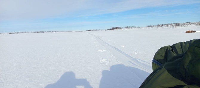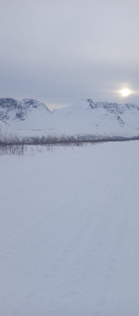 С утра продолжаю свой путь по снегоходной трассе, которая идёт прямо там начерченному ещё дома маршруту. Хорошее совпадение, позволяет экономить силы. Порой встречаются снегоходчики. Как-то разговорился с одними ребятами: они едут к морю, ловить треску, предлагали подвести, ноя отказался. Как-то неспортивно.