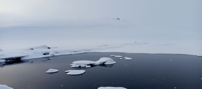 Но вернёмся снова в Кольскую тундру. Ночью низовой пургой немного подзамело снегоходный след, так что скорость упала, приходится чуток тропить. Благо вскорости выхожу на Трящинское озеро, где снег зафирнован. Идти становится приятнее. Далее, от Трящинского озера по системе озёр иду на Вящинское озеро и далее в сторону моря, а точнее губы Кекурская. По пути прохожу нанотехнологичные перевальчики между озёрами. А при выходе к губе, при преодолении последнего водораздела, в виде перевала пришлось потрудится при спуске, поскольку снег на нём хорошо зафирнован и уклон крутой. Зато с этого перевальчика взору наконец-то открылся простор Ледовитого Океана: тяжелый темный простор уходящий за горизонт.