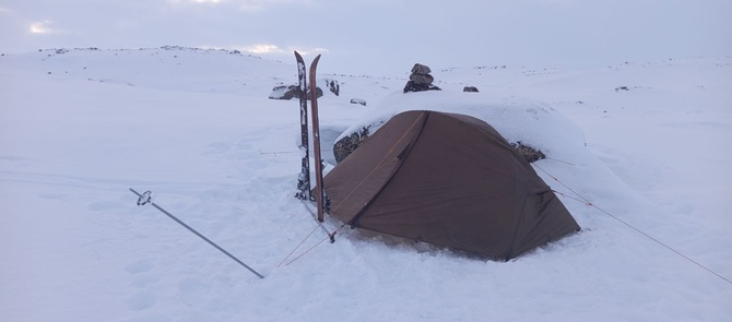 Но вскоре погода портится: ветер, уменьшилась видимость, пошла мести слабая позёмка. Делаю попытку найти место на для лагеря на Западном берегу озера Китеявр, поскольку карта здесь рисует какие-то возвышения и разбросанные каменюки. Но потеряв полчаса на поиски, иду дальше. Пройдя озеро нахожу закуток, где несильно дует: отличное место для ночёвки. К тому же рядом межозёрноя протока не совсем замёрзла и там живая вода. Вечером сделал компот из несъеденной днём кураги.