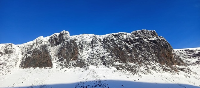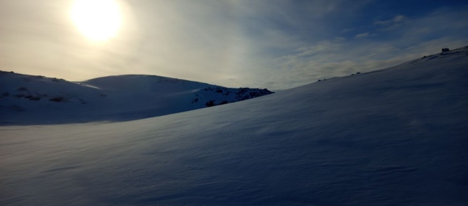 Около озера в конце долины делаю привал, чтобы и попить чайку, но главное – чтобы утеплиться, ведь дальше, по моим предчувствиям, будет ветер крепок. Утеплившись, пошёл вверх, бодро набирая высоту. Из двух кулуаров, что ведут на перевал, выбирают тот, что по правую руку. Второй кулуар и дальше, и там покруче. Солнышко поднялось и порадовало. На лыжах стал немного подлипать снег, но это и хорошо, поскольку я лезу на лыжах вверх, а подлип помогает лыжам не проскакивать назад. Благодаря этому я довольно высоко поднялся не снимая лыж. Но всё же склон становится круче, и приходится снять лыжи, и привязав их верёвочкой к себе, продолжаю подниматься.