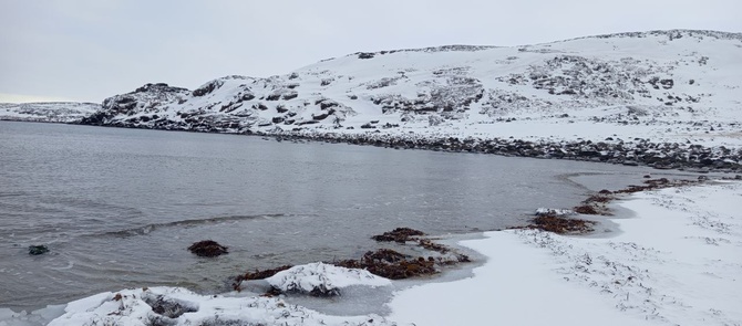 Отогревшись и напившись чая, иду на прогулку к морю. Прошёлся по берегу, испил воды из океана: слабо-солёная, полкружечки уговорил, закрыв гештальт. Потихоньку гуляю по губе без рюкзака – прекрасно. Тут подъезжает на снегоходе один из парней, что сидели в избушке, предлагает поехать с ним до домика, что около мыса Буторин. Как писал классик: «Какой русский не любит быстрой езды!» Решаю побаловать себя родео на снегоходе, и погрузив лыжи и себя в прицеп, наслаждаюсь окрестными видами и тряской. Завершаю вояж уже у избушки, чтобы снова испить чая и насладится теплом.