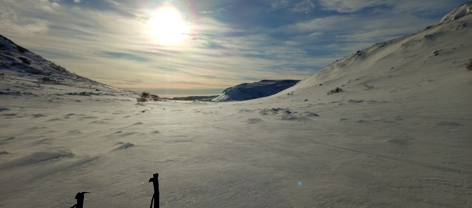 На спуск иду не на седловину, а намереваюсь спуститься по южному склону горы Маннепахк, которое более полого, чем седловина. На плато встречаю порой следы от снегоходов, которые идут в том направлении, куда я и задумал. Идти хорошо, небольшой уклон вниз, можно насладится спуском и окрестными видами. Вскоре подхожу к кулуару ручья, одного из истоков Киткуая, и по нему аккуратно еду вниз, поскольку саночки, что едут сзади пытаются меня догнать и стукнуть по ногам. Спуск с гор – это не самое сильное моё умение в лыжном туризме, так что стараюсь не упасть, хотя пару раз пришлось тормозить попой, ибо сильно разогнался. Ну наконец-то и съехал вниз, в основную долину. Делаю привал на снегоходной трассе, наслаждаюсь какао и видом на скальные стены, что обрамляют озеро Киткъявр… И тут выезжает снизу снегоход: молодой человек катает свою спутницу, укатывая её в сторону, откуда я спустился. Хороший знак- снегоход расчистил мне путь вниз, так что надо поспешать.