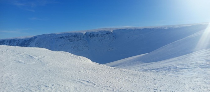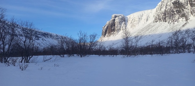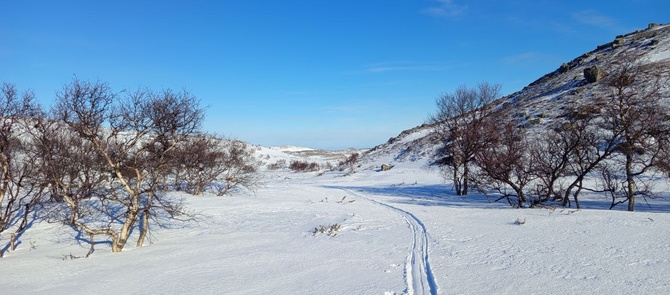 Утро ясное, значит морозное. Неба синь над головой, а под ногами, вернее лыжами снег, покрытый небольшой корочкой ледка, что намёрз благодаря вчерашней оттепели и ночному морозу. Идти немного неприятно, поскольку чуток проскальзывают назад. Но зато не налипает снег на лыжи, как это было вчера. Иду по верхней части долины, сквозь кусты, которые становятся всё реже и реже. Идти хорошо: нежарко, ветер слабый, поскольку далеко ещё до взлёта на плато, кусты мелкие и не цепляют за саночки. Над головой глубокая синь неба, вокруг меня чёрные скалы, впереди вьётся белая долина, упирающаяся во взлёт, ведущий на верхнее плато, а позади уходит вниз лесная долина, которая упирается в белое пятно Сейдозера, обрамлённое берегами из леса, и далее скалами и сопками Ловозёрского массива. Красота!