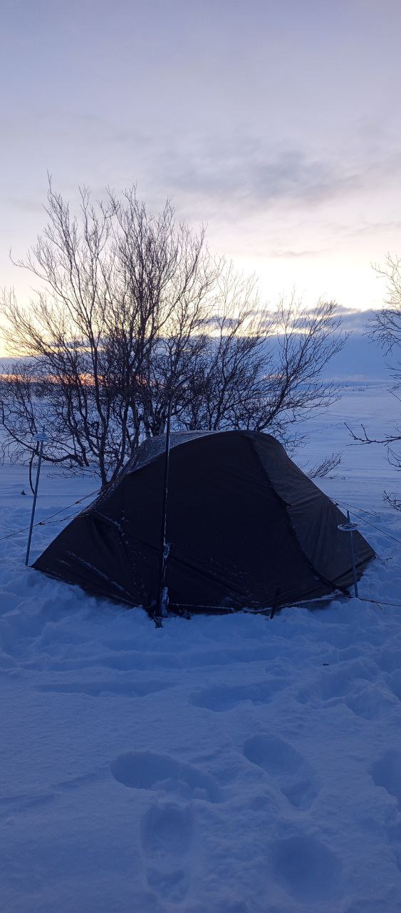 Кстати, дорога проходит там, где по карте навигатора показана дорога. Эх, знать бы это заранее, я бы тогда дня два назад, пройдя сквозь Лявозеро, свернул бы на Контозеро и пройдя его, пошёл на Юг и подрезал эту дорогу. Но что уж локти то кусать. Радуюсь тем, что есть. Дорога прошла немного там, где была нарисована на карте, а потом стала петлять по холмам, порой проходя сквозь заросли кустов. Но кусты не мешали, ибо об этом позаботились полчища вездеходов. Постепенно погода улучшилась, ветер стих. Дорога пересекла речку Чёрная, а солнышко приблизилось к горизонту. Иду в ближайшие кусты ставить палатку. Но перед этим любуюсь чарующей картиной заката, где солнышко красит снег в ещё один оттенок белого…