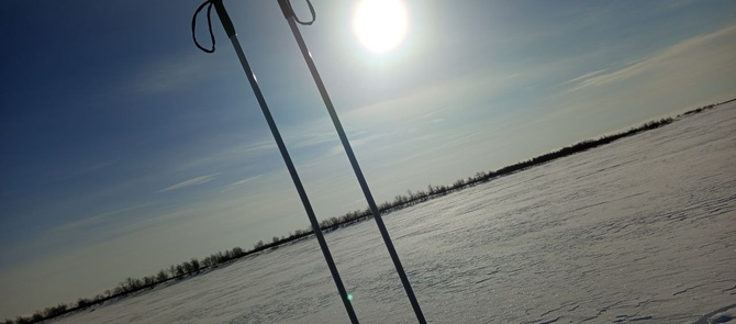 Утро порадовало солнцем. Вчерашняя непогода улеглась и небо снова радует голубым цветом. Собираю свои пожитки. Саночки уж готовы и рюкзак приматываю сверху на саночки. Но вскоре понимаю, что эта идея не сработала. Путь сквозь кусты извилист и саночки постоянно цепляются за них, санки переворачиваются и приходится с матом возвращаться и переворачивать их в нормальное положение. Приходится отвязать рюкзак от саночек, одеть его на плечи и прорваться сквозь заросли кустов на озеро. На озере около берега пушистый снег, поскольку его нанесло сюда ветром, приходится сильно тропить, отходя подальше от берега, где меньше снега. Там снова прилаживаю рюкзак на саночки, и в придачу закрепляю вверху спальник на просушку и вперёд по озеру. В отличии от прошлых дней, теперь приходится тропить, поскольку вчерашним ветром нанесло снегу. И сей факт отнюдь не прибавляет оптимизма, поскольку скорость моя снижается и отставание от графика увеличивается. Ветер дует, но не так сильно, как вчера, просто низовая пурга. На небе ясно, небольшие белые облачка лишь пробегают. 50 оттенков белого, что уж тут скажешь.
