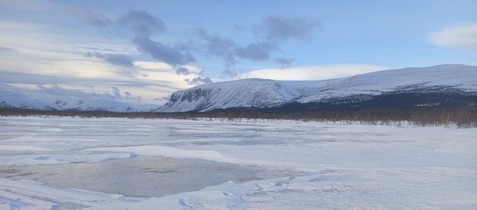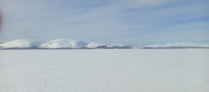 Пейзаж вокруг за последние пару дней радикально изменился. Вместо белых просторов тундры, теперь белая поверхность озера, которая зажата в темные берега леса. Да и лес тут заматерел – вместо чахлых кустиков, тут ёлки, порой сосны, да и берёзка намного массивнее. Да и к тому же по правую руку повышается Ловозёрская гряда, которая заманивает в своё нутро, потихоньку приоткрываясь, всё больше и больше нависая с Запада. Ну и вдобавок, вдалеке возвышается над лесом небольшой массив Панских тундр, который редко посещаются туристами. Надо как-нибудь заглянуть в те края…