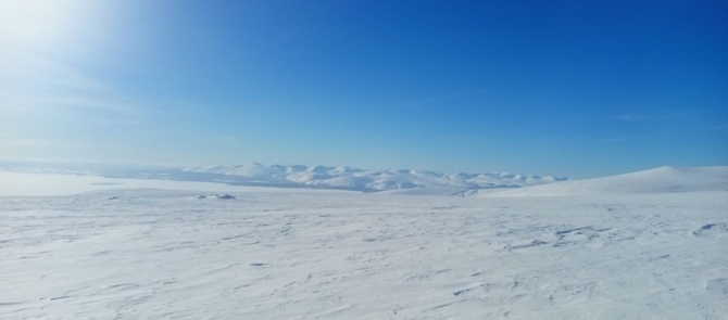 Ну вот и выхожу на выполаживание. Уже почти на куполе массива. Немного набрать и я увижу Хибины. Ну а пока ещё один привал, чтобы полюбоваться окружающей красотой под синим-синим небом. Внизу, Сейдозеро, а потом и Ловозеро. А за Ловозером до горизонта лес, из которого порой торчат голые сопки. Выщёлкиваю ботинки в лыжные крепления и иду вперёд. Там немного вверх, ну и вот я на плато. Вдали показалась вторая часть марлезонского балета – в белых цветах на голубом фоне горное сердце Кольского полуострова - Хибины. Надо туда поторопиться.
