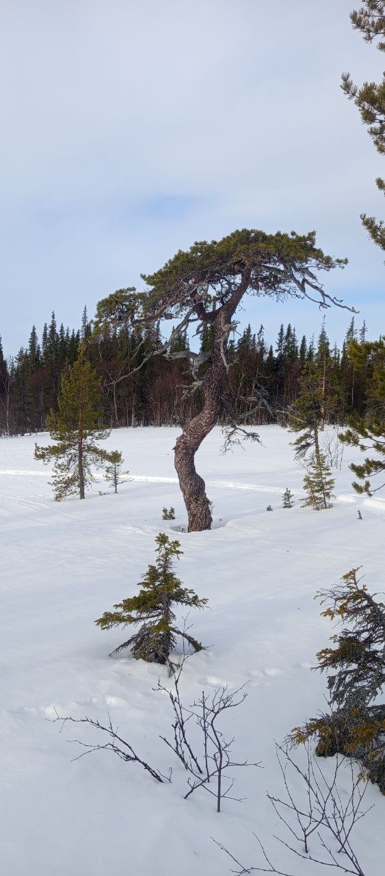 С утра погода шепчет. Небо понемногу проясняется, ветра нет: самое то, что надо для покатушек на лыжах! Выхожу на трассу имени бывшей ЖД и вперёд, наслаждаясь всеми прелестями лыжного туризма: дорога идёт сквозь лес и раскатана снегоходами, справа красоты Ловозёрского массива, слева через хвойный лес иногда проглядывает Умбозеро и лежащие за ним Хибины. Но через километра три буранка поворачивает влево и удаляется через болото в сторону Умбозера. Пробую идти по бывшей ЖД – не понравилось, тут давненько никто не ездил, так что возвращаюсь на буранку. Попутно любуюсь на сосны в стиле бонсай, которыми богата местная природа.