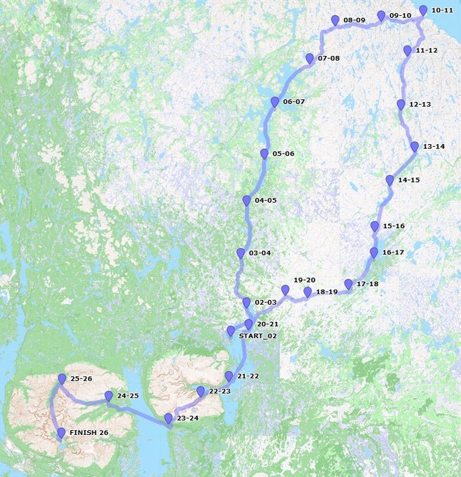 Точками обозначены старт, финиш и места ночевки. Места ночевки обозначены датами с какого по какое число эта ночёвка была. Месяц ночёвки неуказан, ибо он для всех точек одинаков - март.